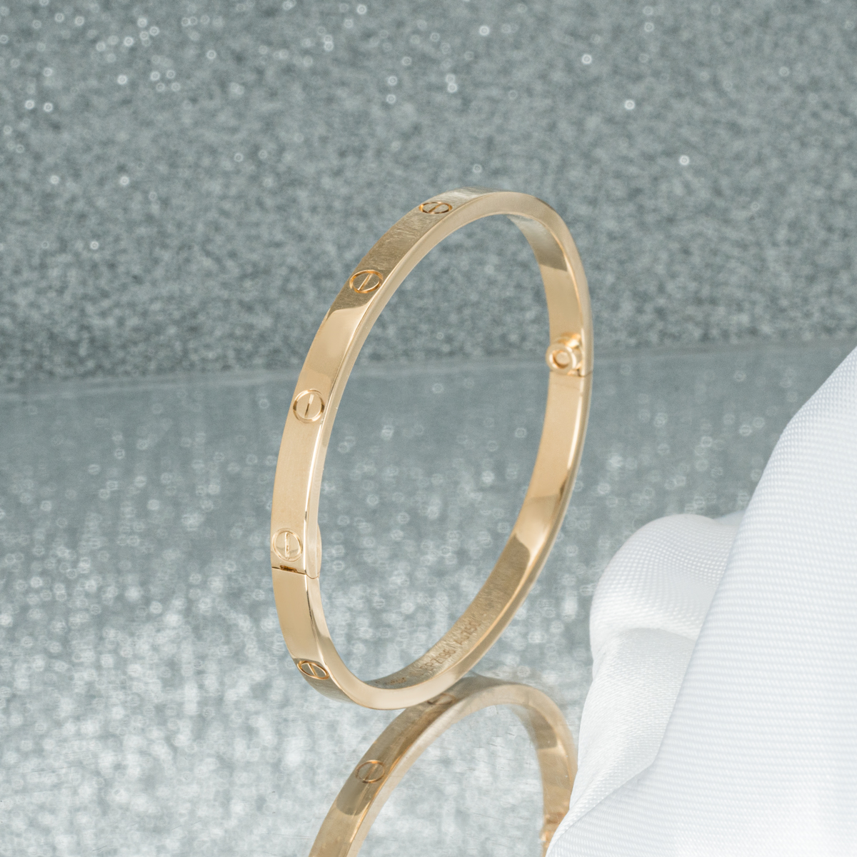 A timeless 18k yellow gold Cartier bracelet from the Love collection. This slimmer version of the classic Love bracelet comprises of the iconic screw motifs and features a single screw and hinge fitting. The bracelet is a size 19, measures 3.65mm in width and has a gross weight of 21.1 grams.