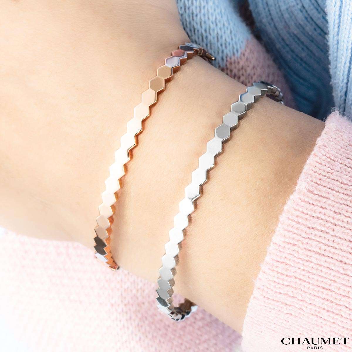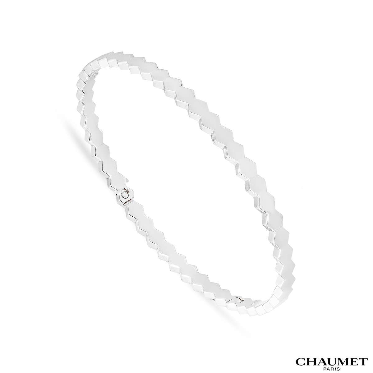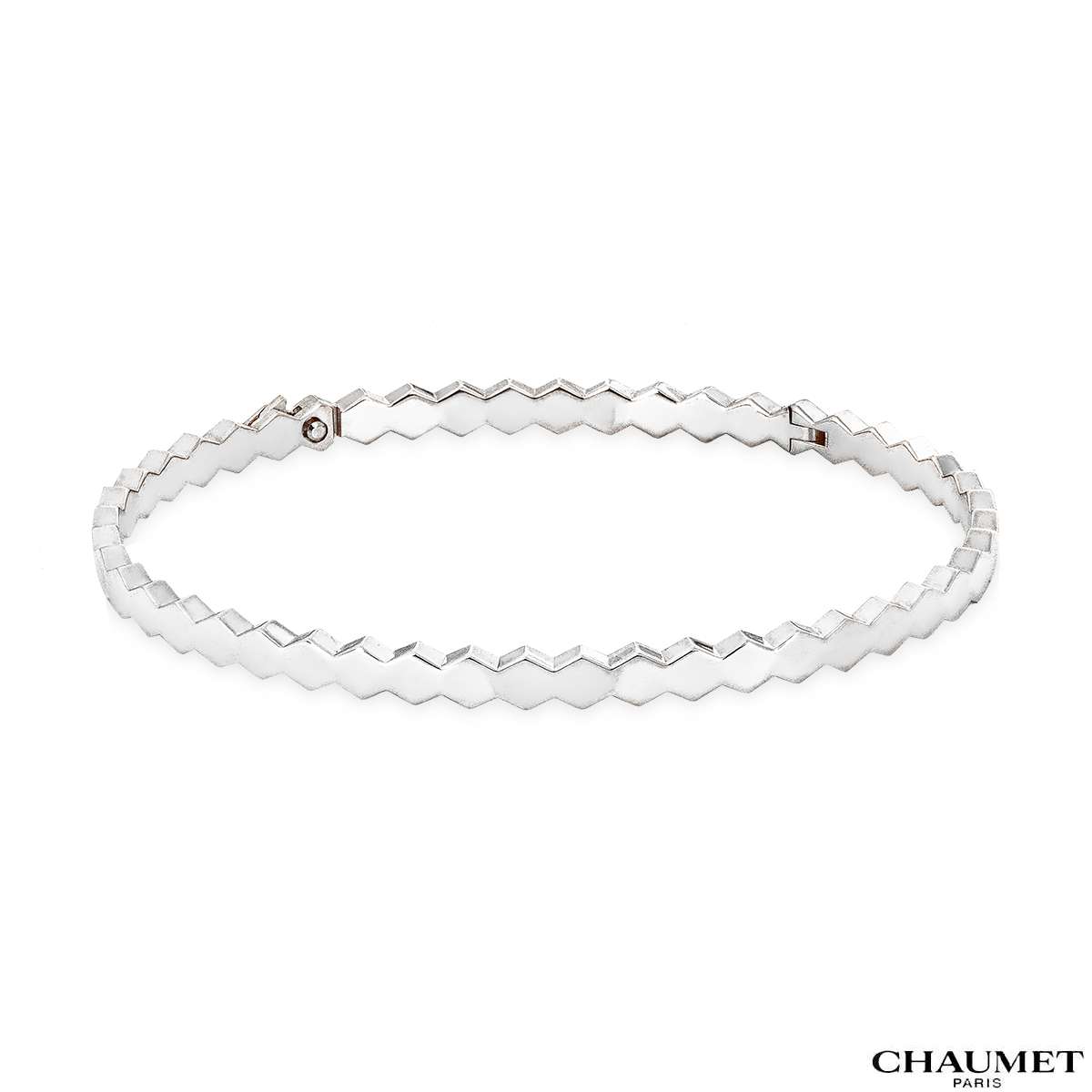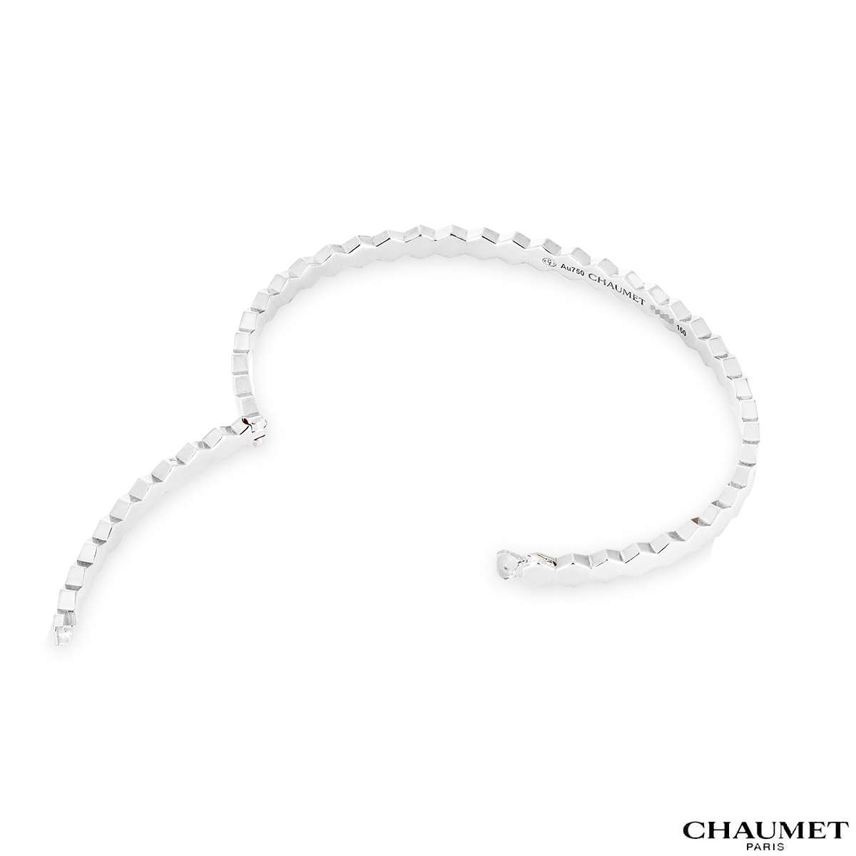 An 18k white gold Chaumet bracelet from the Bee de Chaumet collection. The bracelet showcases the collection’s signature honeycomb‑inspired design, crafted with exceptional precision. This piece measures 4mm in width, fits a wrist size of up to 16cm and has a gross weight of 15.6 grams.
