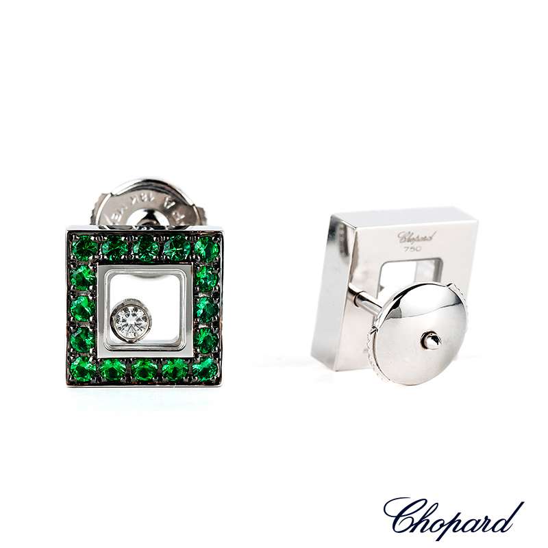 A pair of emerald and diamond earrings from the Chopard Happy Diamonds collection. The earrings are square in shape and each have 16 emeralds and 1 diamond. The emeralds total 0.69ct and the diamonds total 0.11ct. Each stud is 1cm in diameter and have a gross weight of 9.25 grams.