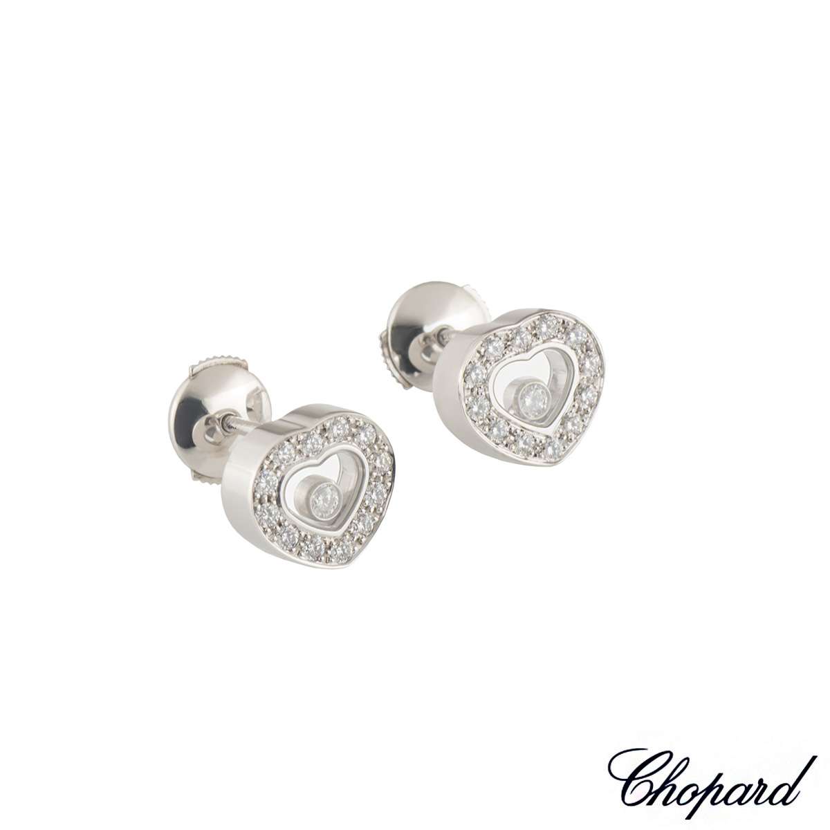 A pair of 18k white gold diamond earrings from the Chopard Happy Diamonds collection. The heart shape earrings have 24 pave set round brilliant cut diamond around the outer edges totalling 0.41ct. Complete with 2 single signature floating round brilliant cut diamonds behind Chopard signed glass totalling 0.11ct. Each stud is 1cm in diameter, with post and alpha back fittings and have a gross weight of 7.35 grams.
