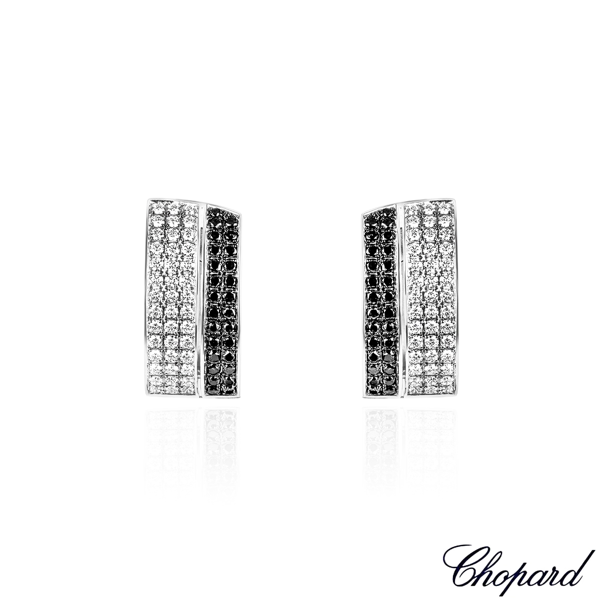 A captivating pair of 18k white gold diamond earrings by Chopard from the Happy Diamonds collection. The square earrings are each set to the outer edge with 32 round brilliant cut white diamonds, set to the inner edge with 20 round cut black diamonds and have 3 round cut floating diamonds in a bezel setting encased behind the signature signed Chopard glass. The earrings have a total diamond weight of 2.59ct, finish with post and omega back fittings and have a gross weight of 20.89 grams.