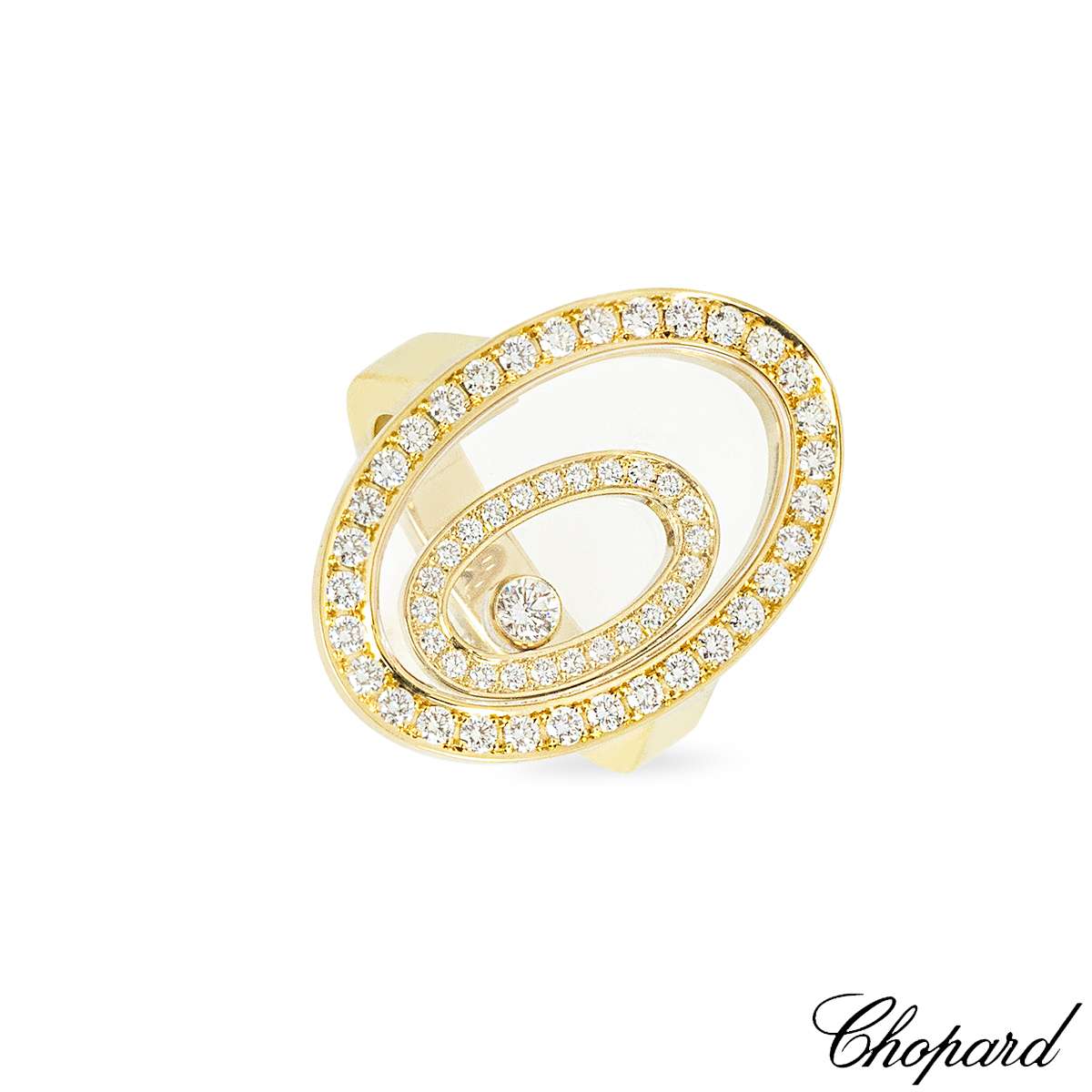 An enticing 18k yellow gold diamond ring by Chopard from the Happy Spirit collection. The ring features an oval motif set to the centre with a round brilliant cut diamond in a bezel setting, weighing approximately 0.07ct, G colour and VS clarity. The central diamond is further complemented by pave set round brilliant cut diamonds set in a floating oval motif. The ring measures 2.5cm in height, has a gross weight of 17 grams and is currently a size N but can be adjusted for the perfect fit.