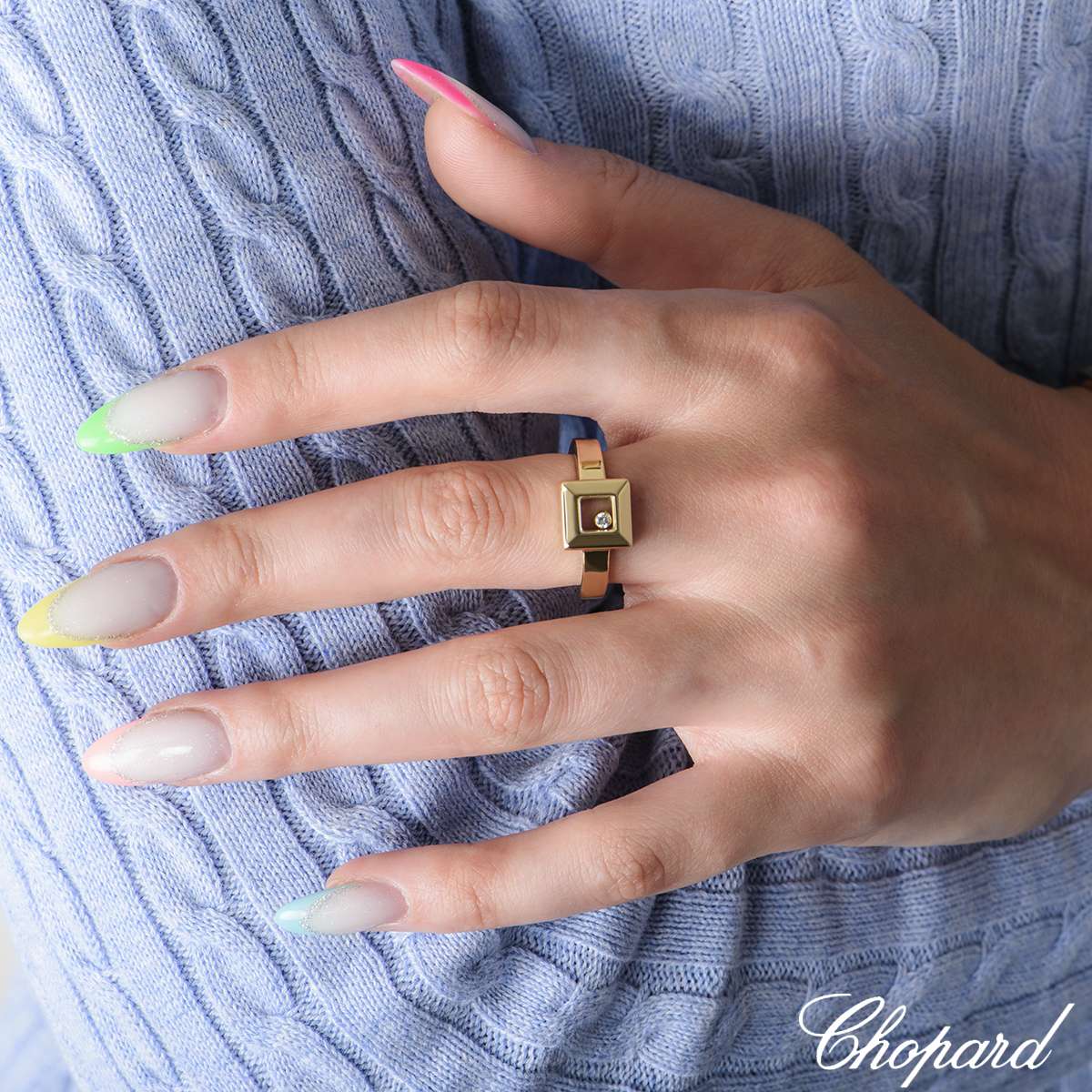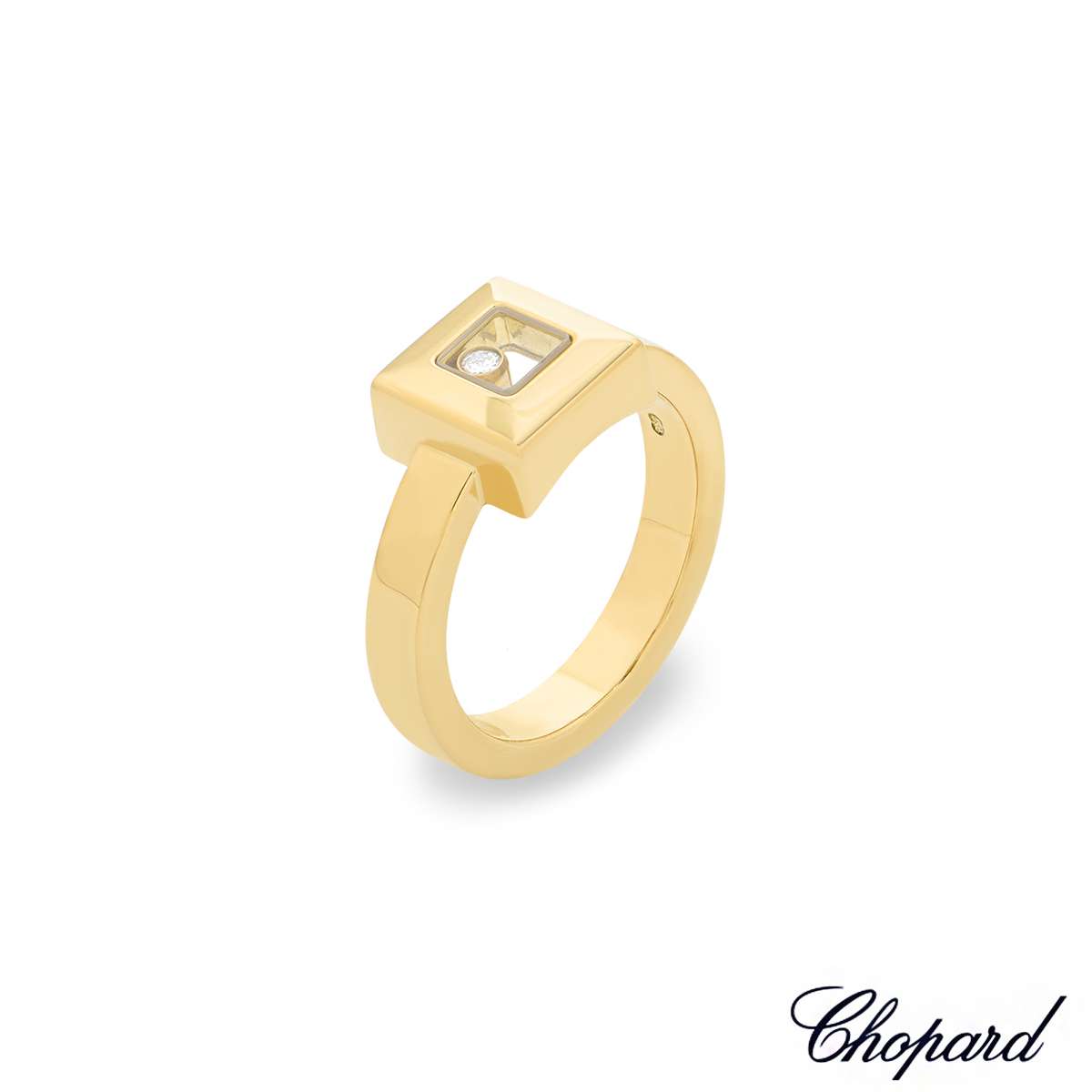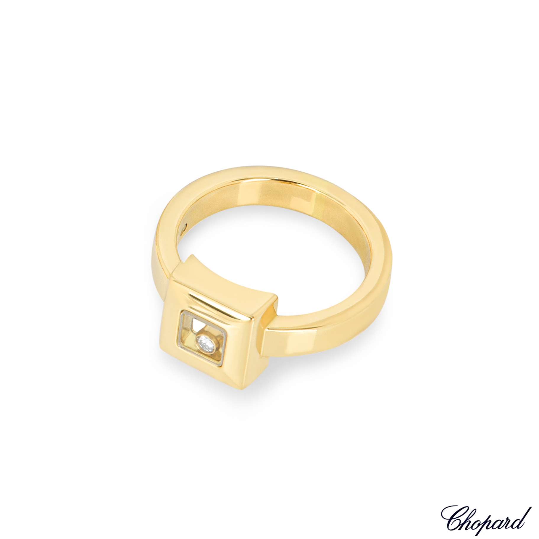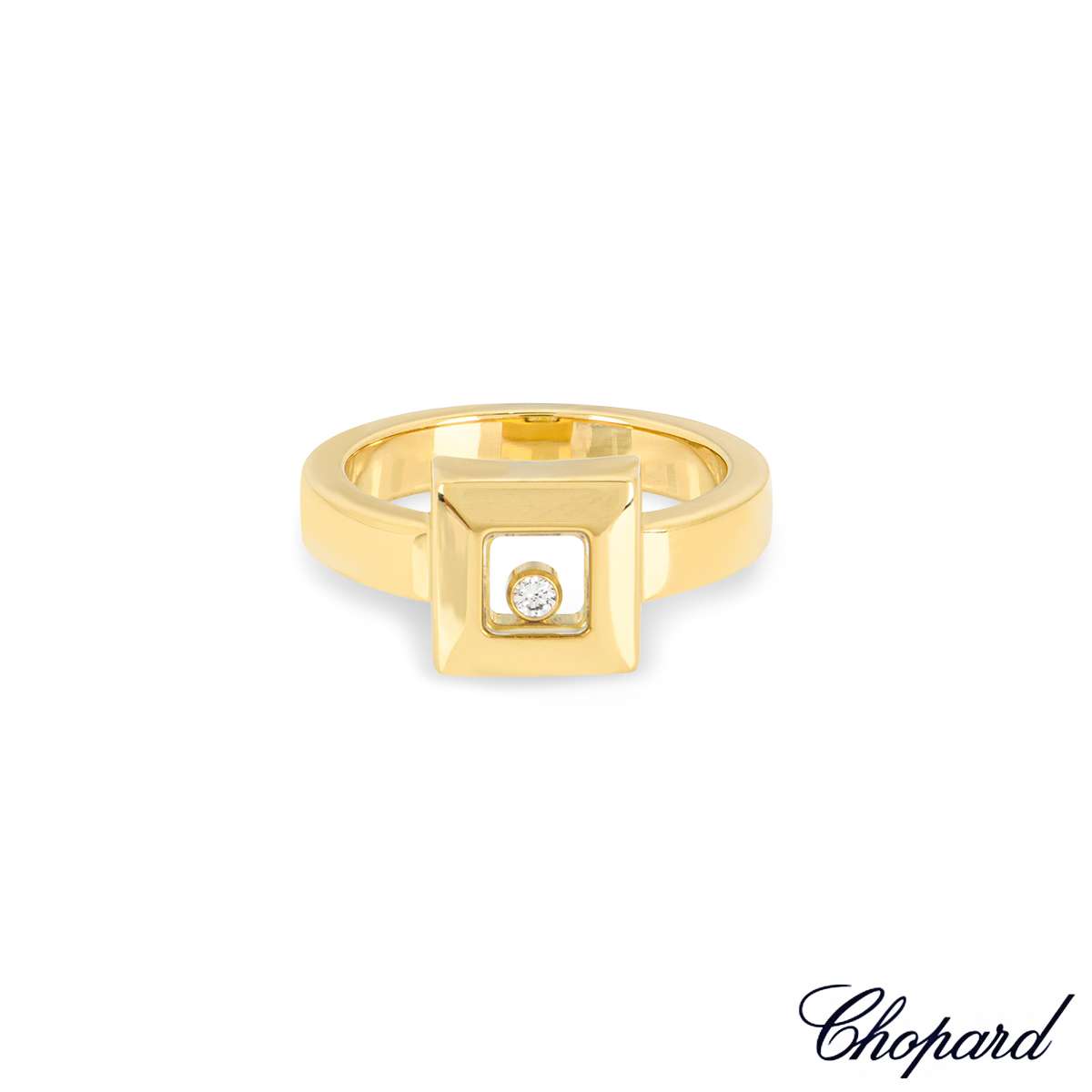 A stylish 18k yellow gold Chopard diamond ring from the Happy Diamonds collection. The ring features a square motif comprising of a floating round brilliant cut diamond set between two iconic Chopard signed glass panels, with an approximate weight of 0.03ct, G colour and VS clarity. The motif measures 10mm in height, has a gross weight of 12.2 grams and is currently a size R but can be adjusted for the perfect fit.