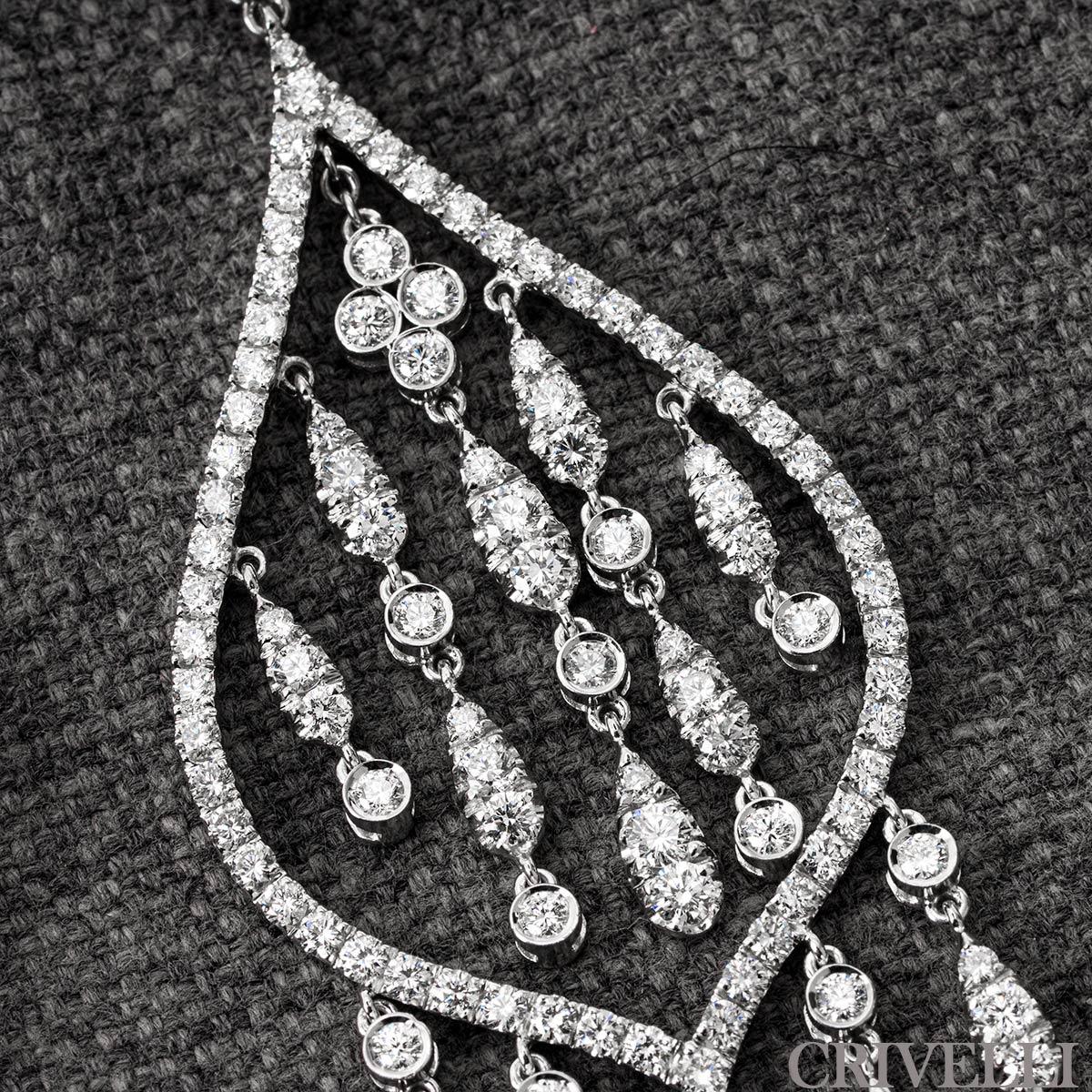 A magnificent pair of 18k white gold diamond earrings. The gorgeous chandelier design earrings are each adorned with 111 round brilliant cut diamonds with an approximate total weight of 7.30ct, E-F colour and VVS-VS clarity. The centre and bottom of the earrings have 5 freely moving strands that glisten in the light. They finish with post and omega-hinged clip fittings and have a gross weight of 30.28 grams.