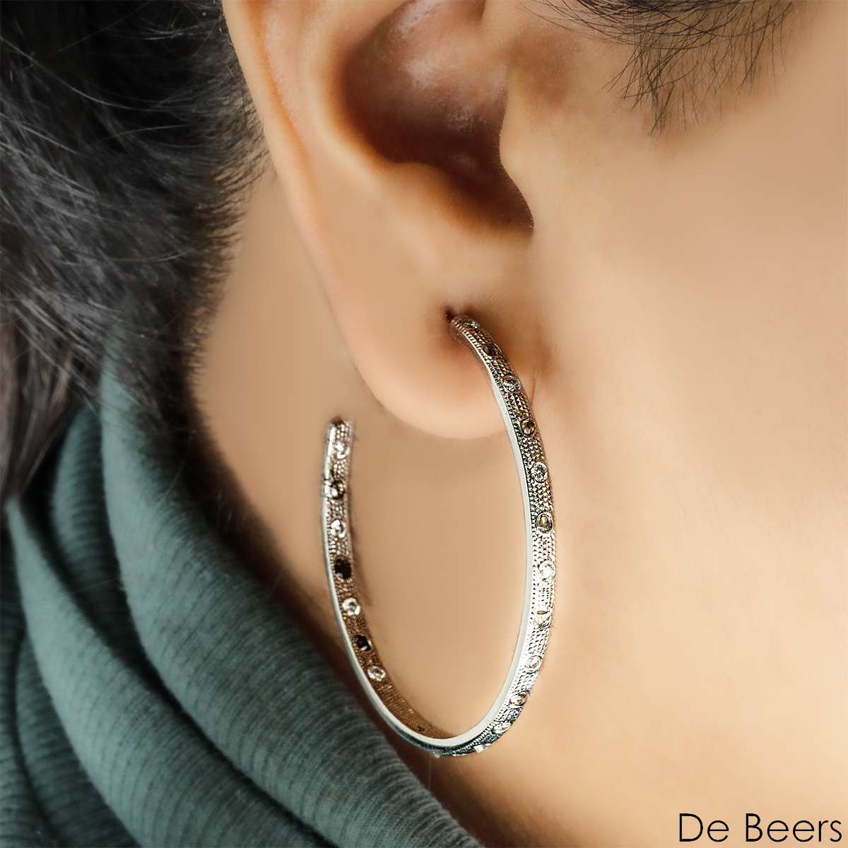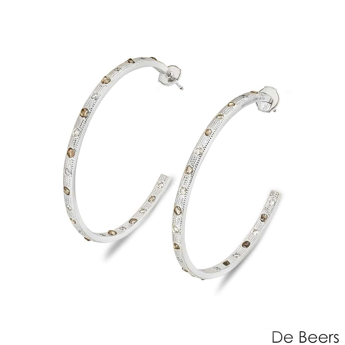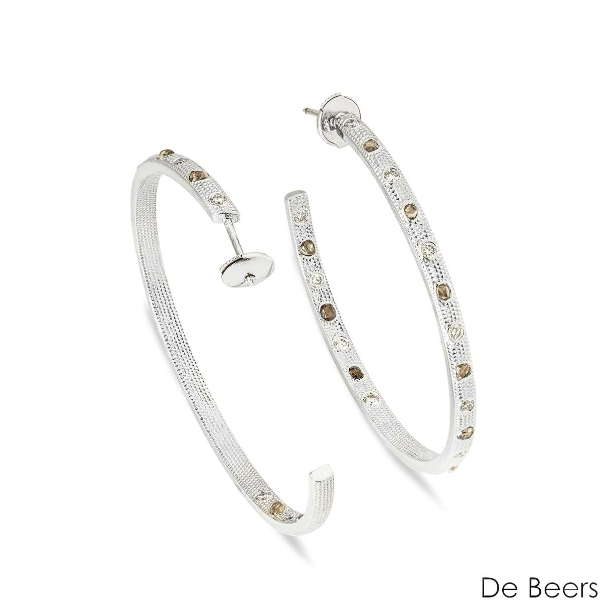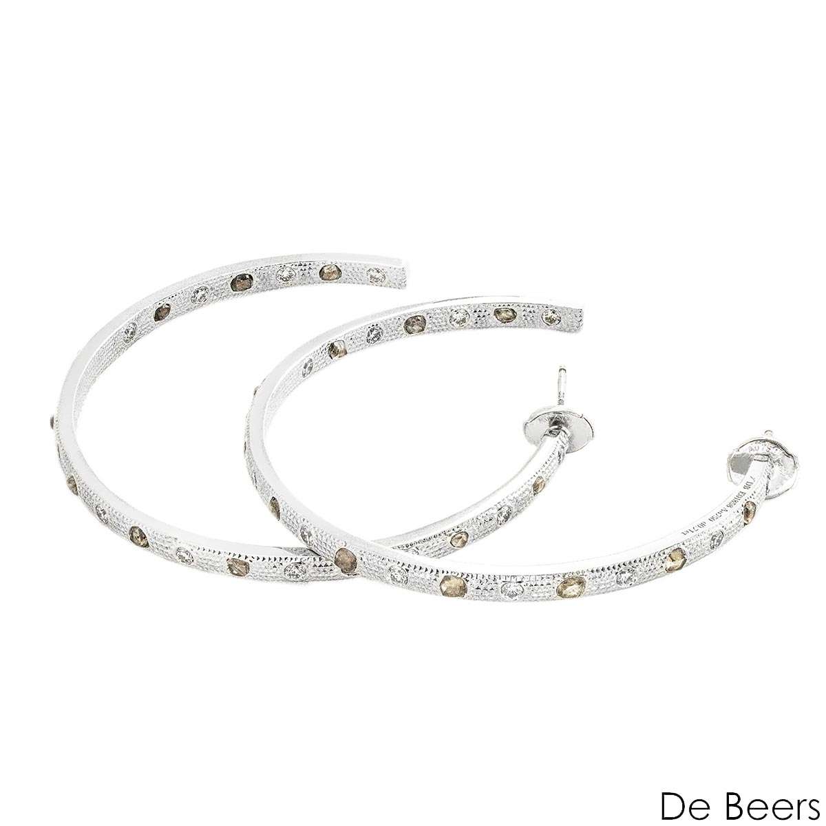A sparkly pair of 18k white gold diamond hoop earrings by De Beers from the Talisman collection. The earrings feature rough and polished diamonds with a texture surface, each set with 11 rough and 12 polished diamonds with an approximate total weight of ~2.20 carats.