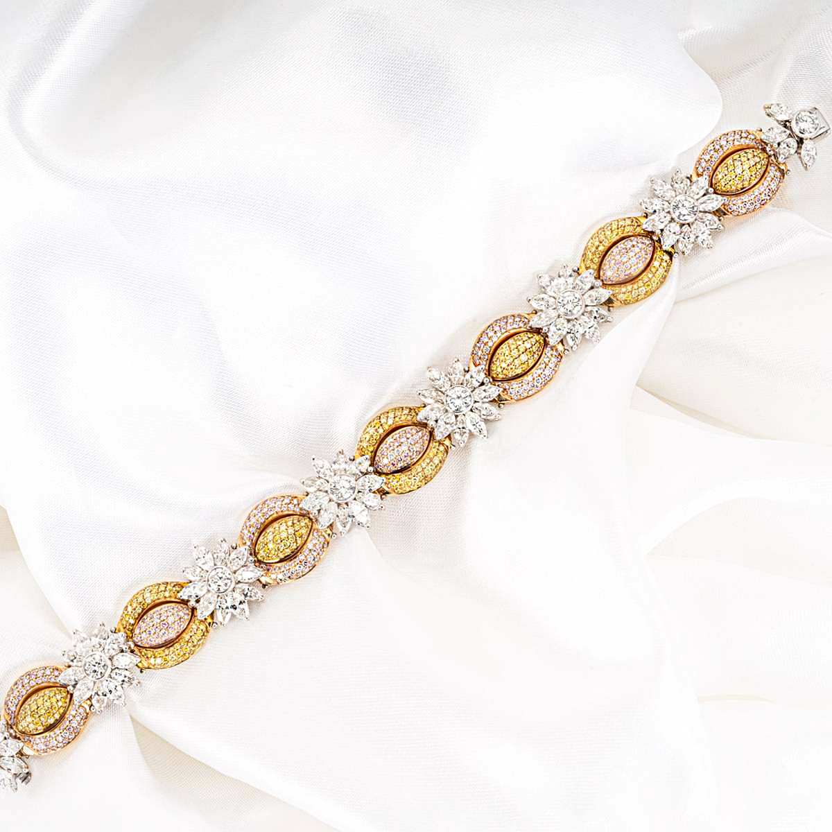 A magnificent platinum diamond bracelet by Garrard. This bracelet is meticulously crafted with 15 round brilliant cut diamonds bezel set through the centre with an approximate total weight of 2.45ct, E-F colour and VS-SI clarity. Further complementing the centre stones are 30 baguette cut diamonds, 30 old cut diamonds and 120 single cut diamonds with an approximate total weight of 6.75ct, E-G colour and VS-SI clarity. The bracelet measures 7-inches in length, 11mm in width, finishes with a push clasp with a single figure 8 safety clasp on the side for added security and has a gross weight of 35.76 grams.