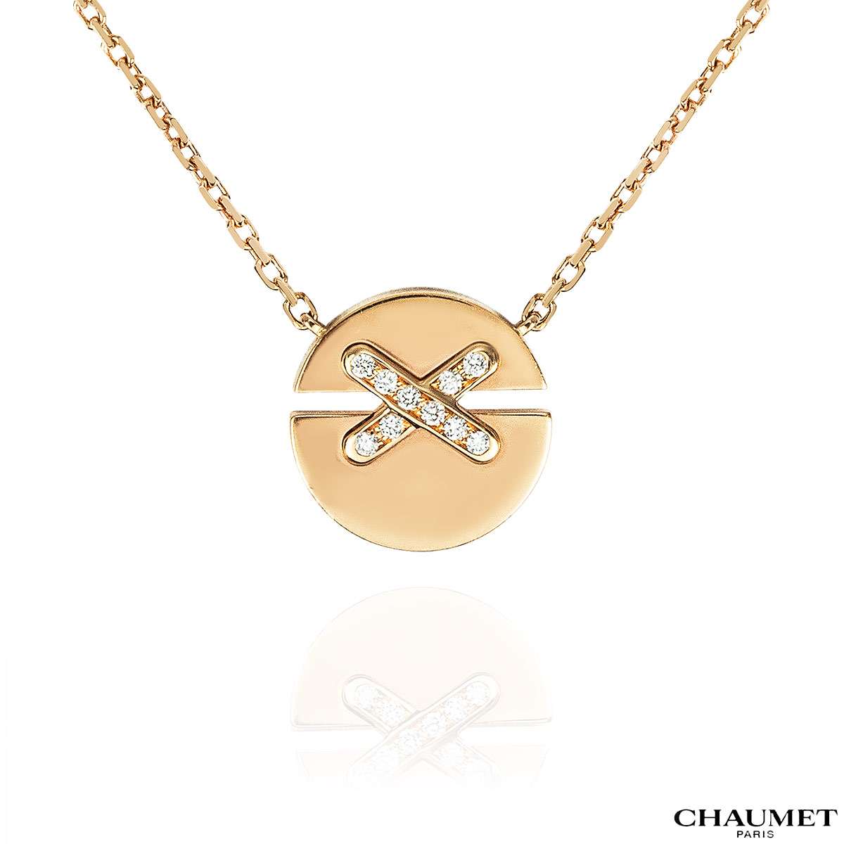 This 18k rose gold diamond pendant by Garrard, part of the Tudor Rose Collection, features a delicate rose motif adorned with approximately 41 round brilliant-cut diamonds in a pavé setting. The motif measures 13mm in width and is elegantly suspended from a 18-inch trace chain, secured with a lobster-style clasp. The pendant has a gross weight of 4.2 grams.