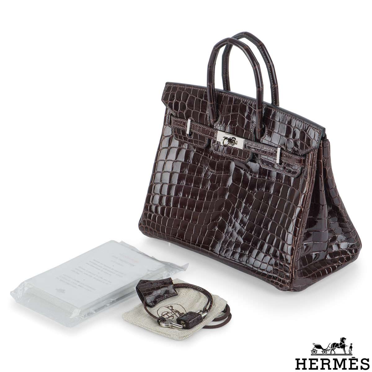 A classic Hermès 25cm Birkin bag. The Cacoan shiny Niloticus Crocodile skin bag is detailed with palladium hardware. The bag has dual rolled top handles complete with padlock and a hanging clochette and keys. The interior features one zipped and one open pocket. The bag is in mint condition, complete with factory stickers on feet.