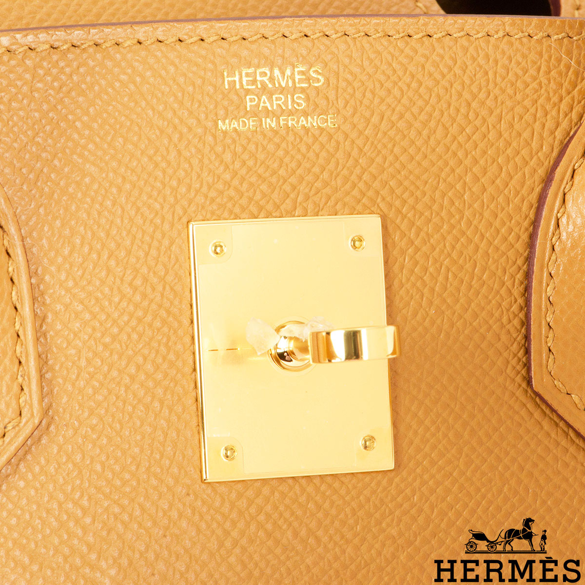 A stylish Hermès 30cm Birkin handbag. The exterior of this Birkin is in Sesame Veau Epsom leather with tonal stitching. It features gold tone hardware with two straps and front toggle closure. The interior comprises of a zip pocket with an Hermès engraved gold tone zipper pull and an open pocket on the opposite side.