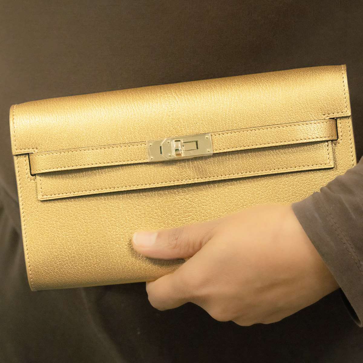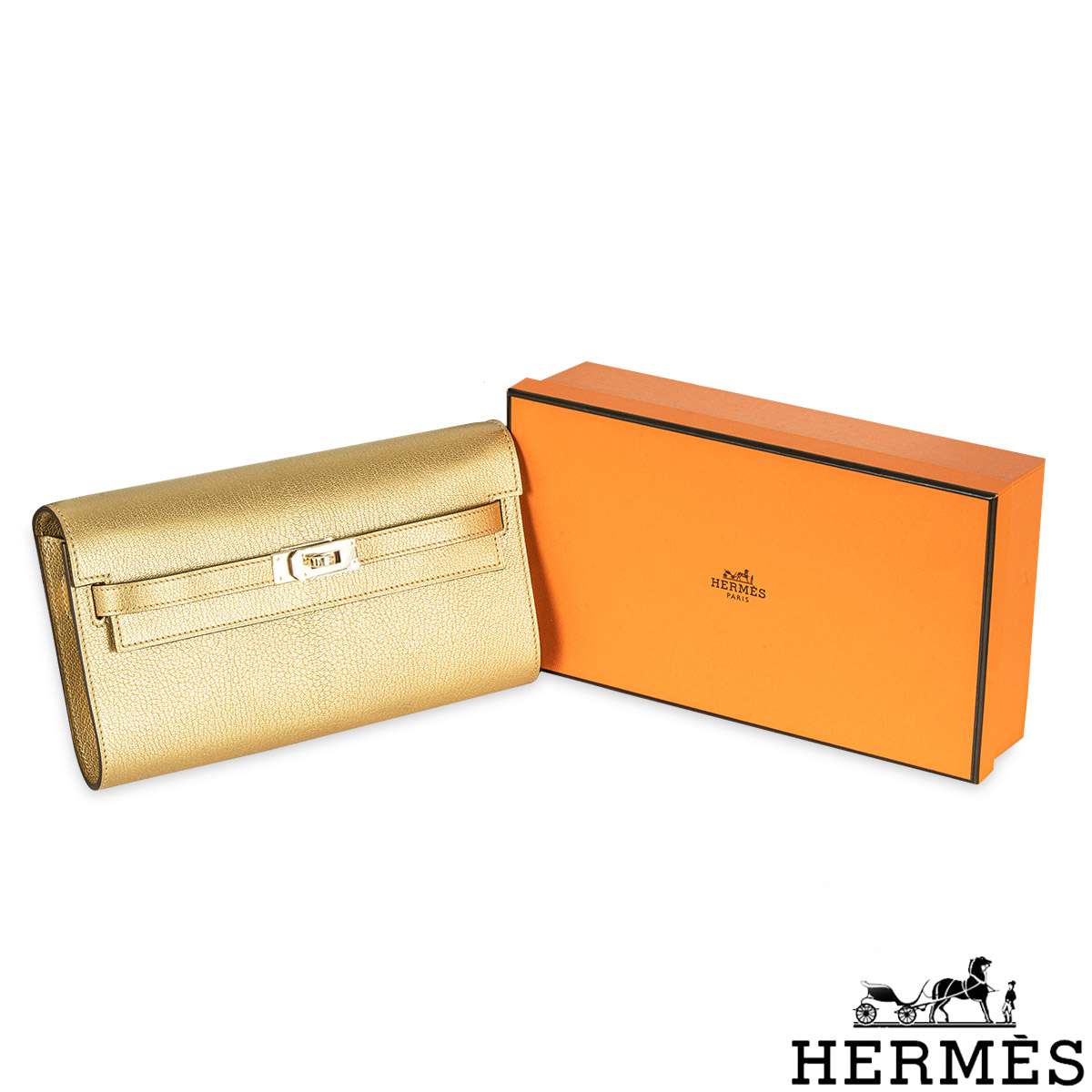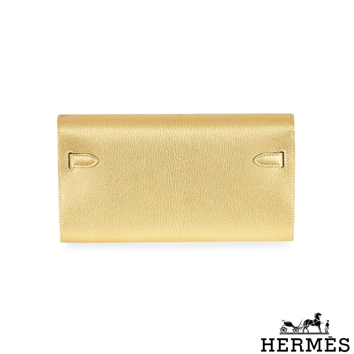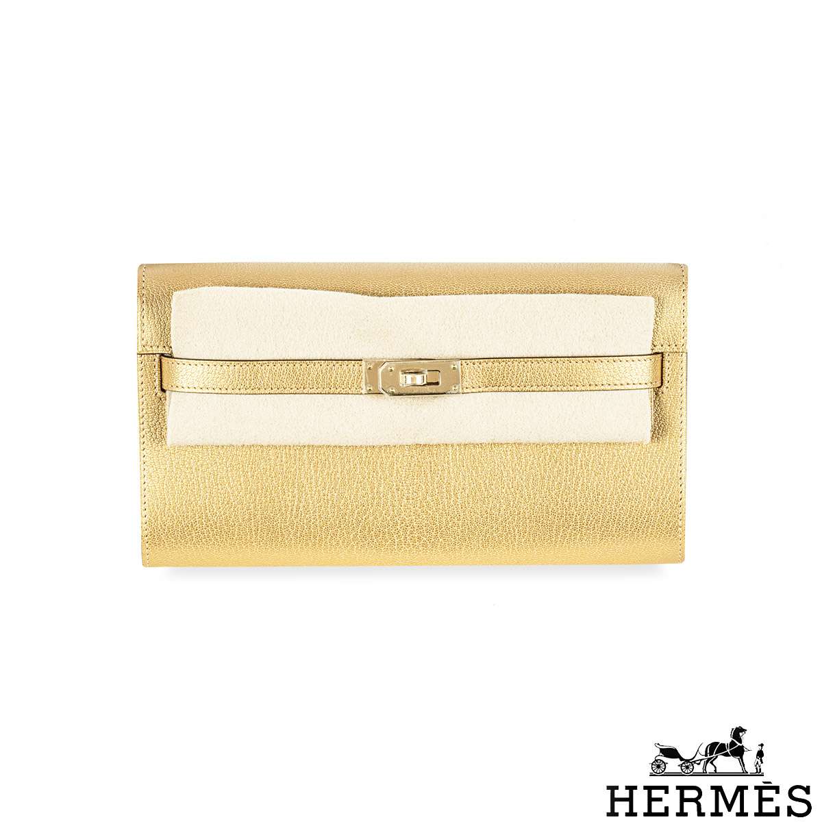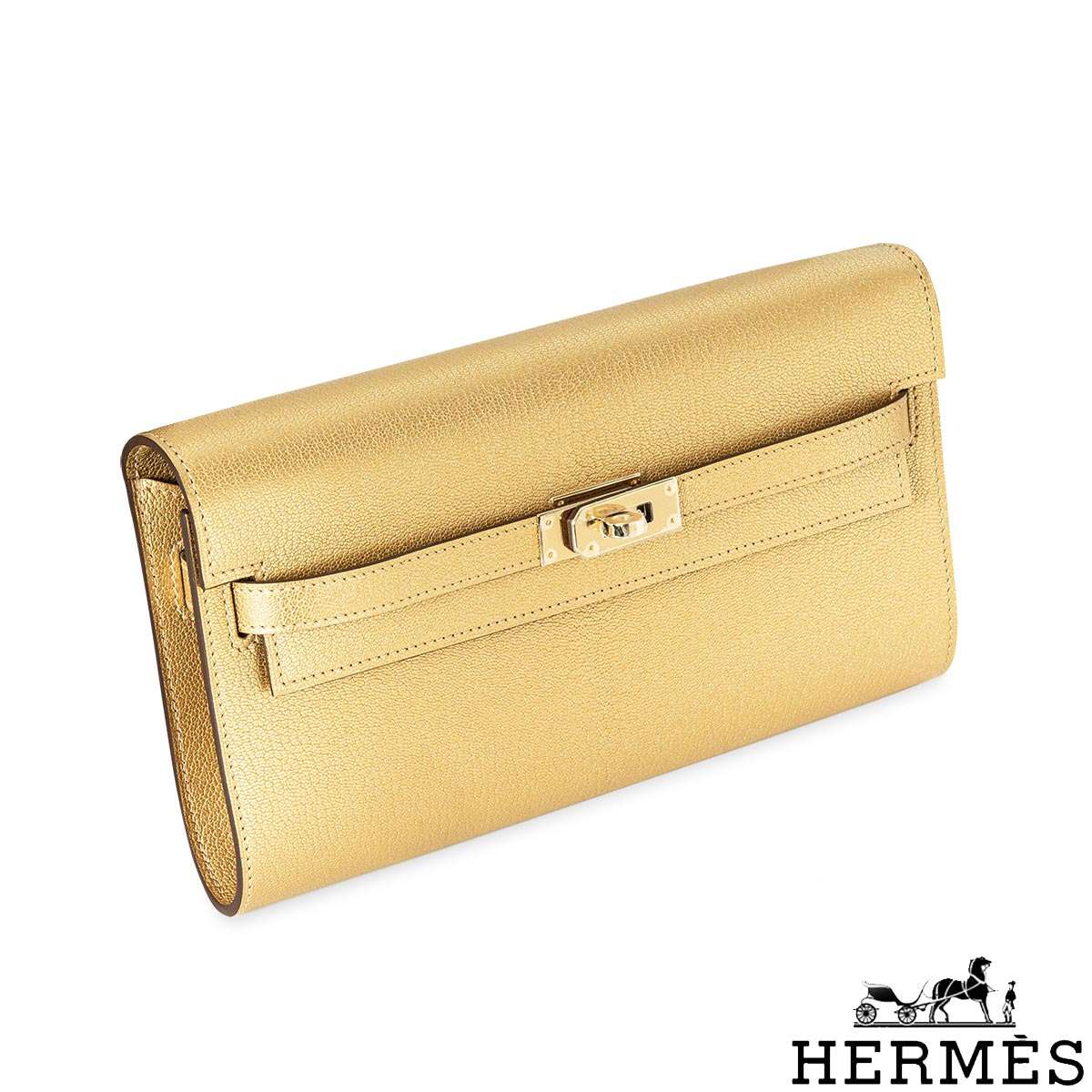A unique Hermès Kelly To Go 20cm Wallet. The exterior of this Kelly To Go features the Dore Chevre style in Gold Chamilight leather and is complemented by gold hardware and tonal stitchings. It has a front toggle closure with two strap and a removable shoulder strap. The interior features one zipped pocket with a Hermes lock zipper pull and two open pockets on each side. The bag is store fresh, full set with factory stickers on all hardware.