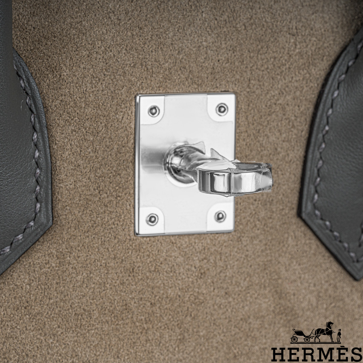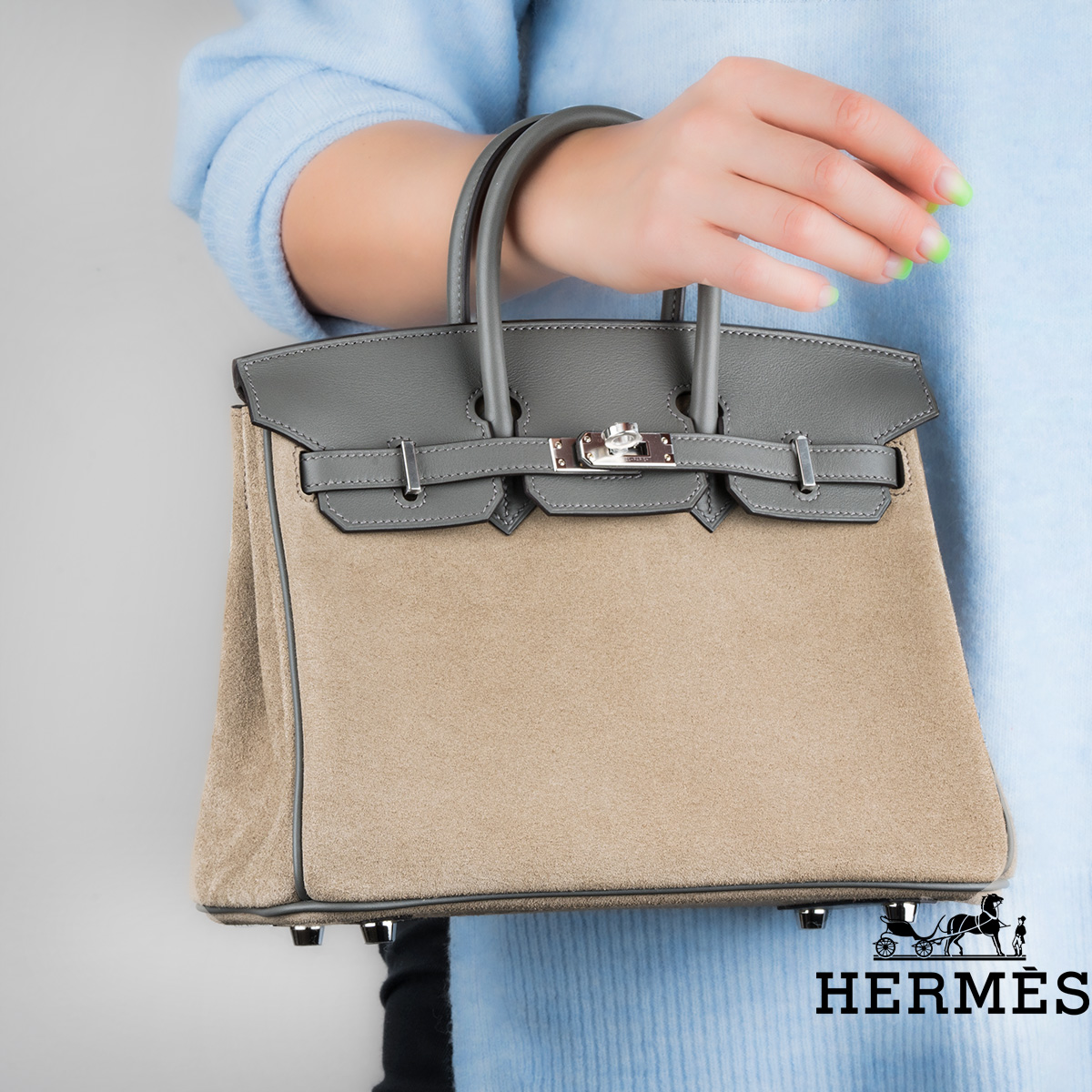 A rare Hermès Birkin 25cm handbag. The Grizzly Birkin is the namesake edition designed to showcase Veau Doblis Suede. The exterior of this Birkin is crafted in Gris Caillou Grizzly and Gris Meyer Veau Swift leather with tonal stitching. It features palladium hardware with two straps and front toggle closure. The interior, lined in Gris Meyer Veau Swift leather, has a zip pocket with an Hermès engraved zipper pull and an open pocket on the opposite side. This bag is store fresh, full set with factory stickers on all hardware.