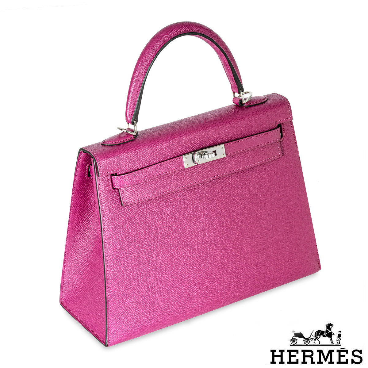 A spectacular Hermès 25cm Kelly bag. The exterior of this Kelly features a Sellier style in Rose Pourpre leather. The Rose Pourpre leather is complemented with palladium hardware and tonal stitchings. It features a front toggle closure with two straps, a single rolled handle, and a removable shoulder strap. The interior is also lined with Rose Pourpre leather and has one zip pocket with a Hermès engraved pull and one open pocket on the opposite side.