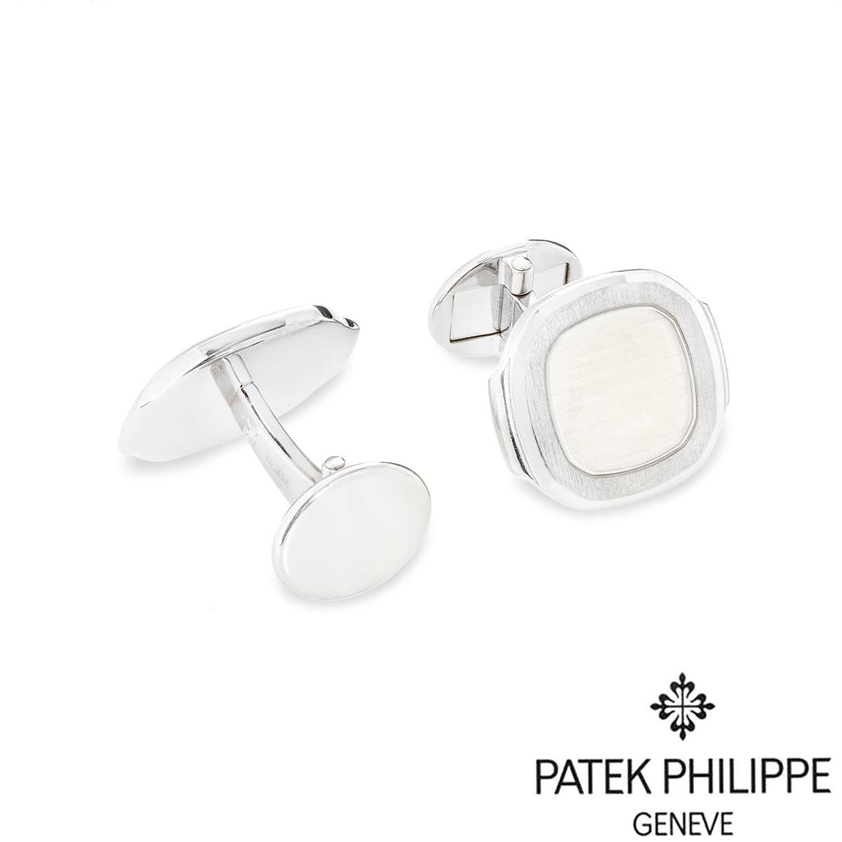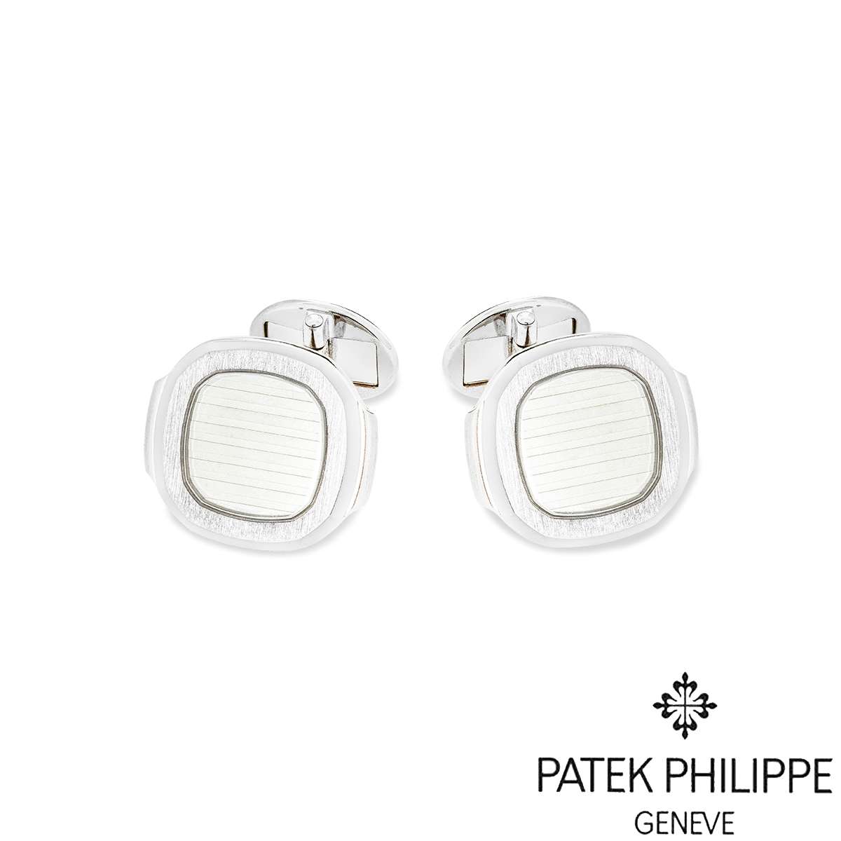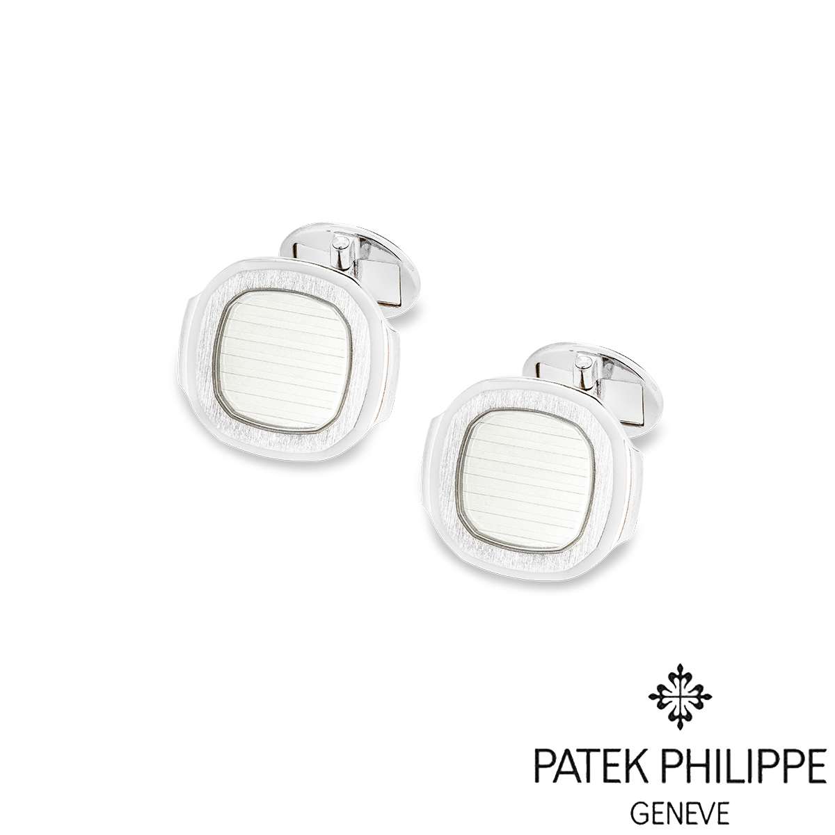 A stylish pair of 18k white gold cufflinks by Patek Philippe, from the Nautilus collection, available now at RichDiamonds London. The cufflinks are set with a silvery-white Nautilus panel surrounded by a satin finish border. The cufflinks measure 2.2 cm in length, 1.9 cm in width, and have a gross weight of 23 grams.