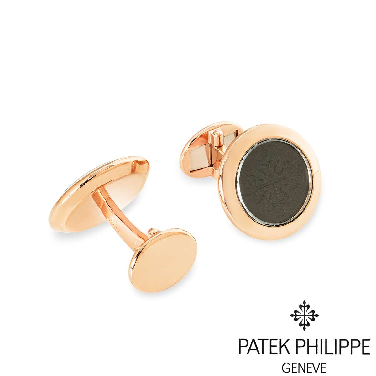 A pair of Patek Philippe Calatrava Cufflinks, Ref. 205.9107R-001, available now at RichDiamonds London. A must-have accessory crafted from 18K rose gold. Each cufflink features a black onyx centre, engraved with the iconic Calatrava cross emblem, protected by a sleek sapphire crystal. Securely fastened with a whale-back fitting. The cufflinks measure approximately 18 mm in diameter, approximately 22 mm in length and have a gross weight of 22.6g.