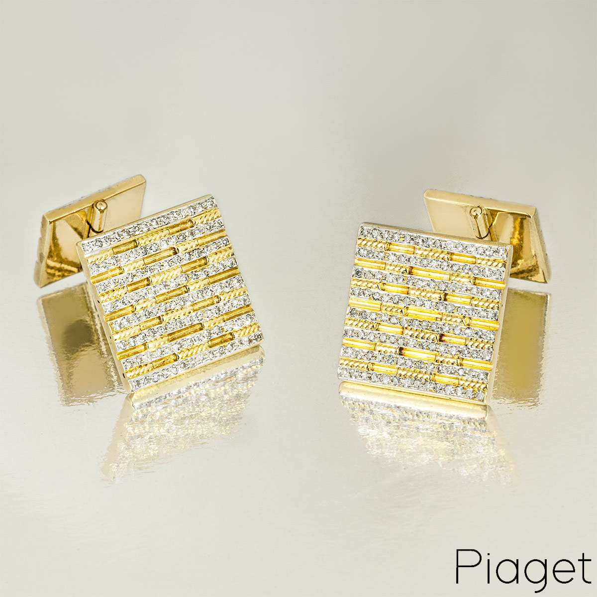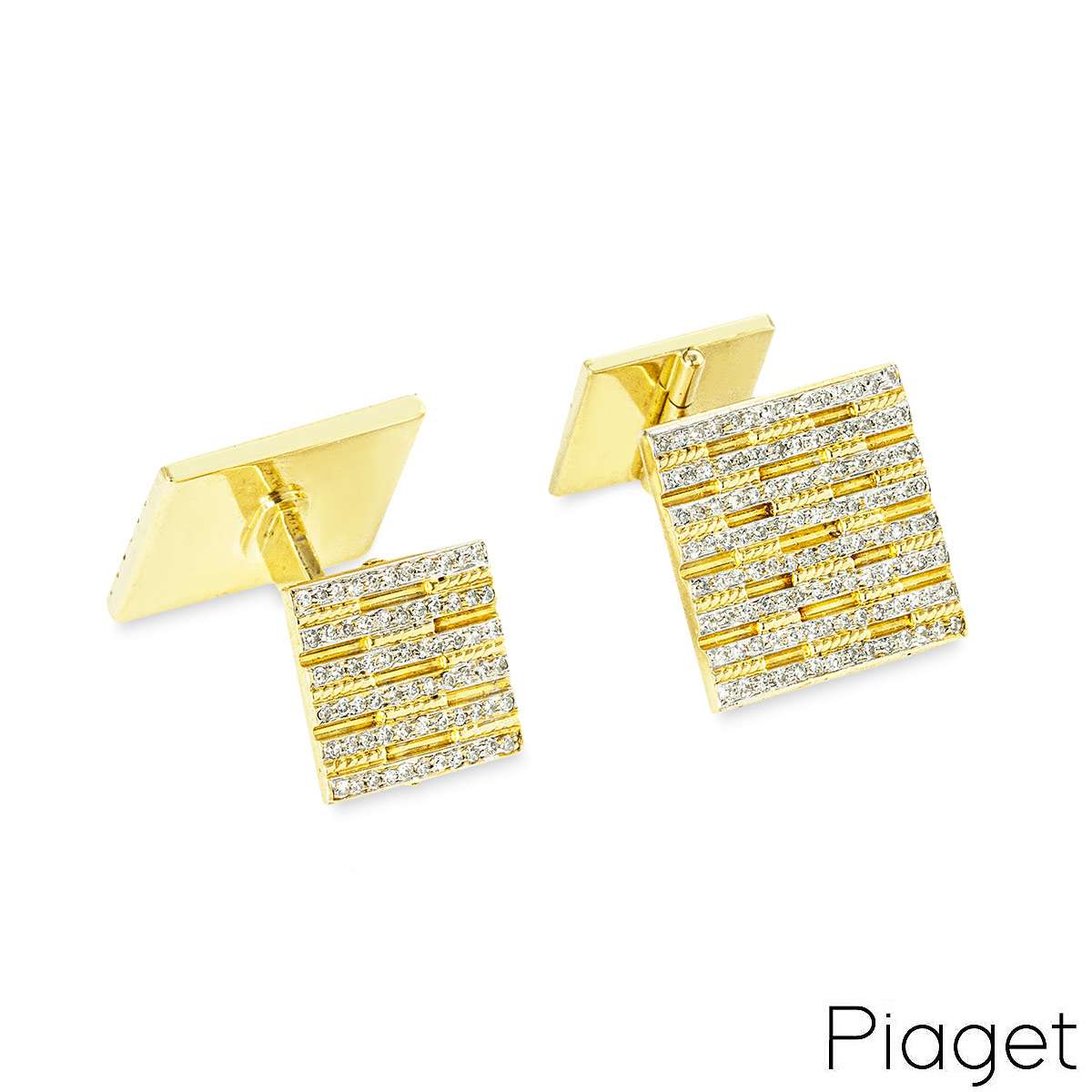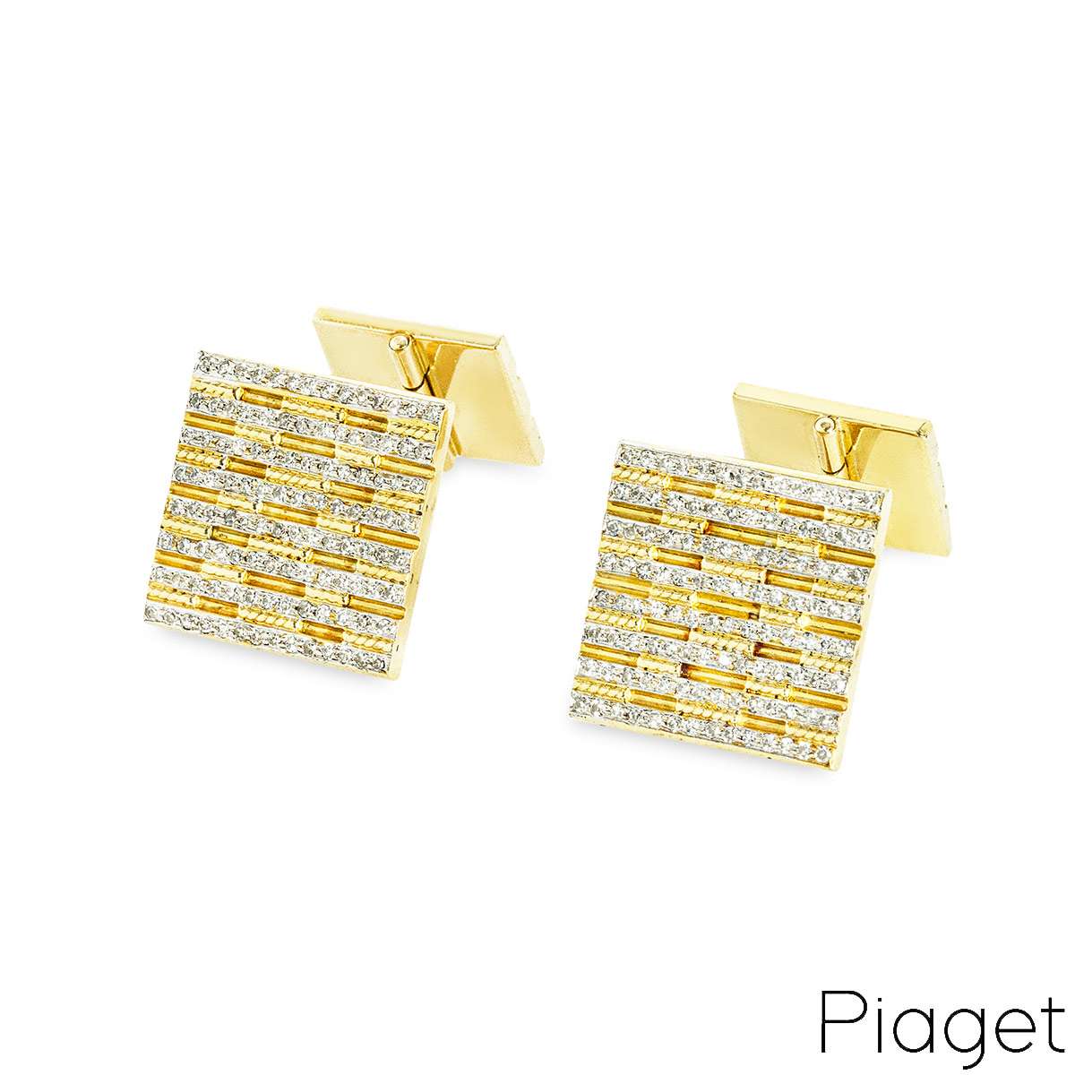 A pair of dress cufflinks in white and yellow 18k gold by Piaget. Each cufflink features a square motif measuring 16mm x 16mm with alternating rows of yellow gold and diamond-set white gold. The whale back fittings feature a smaller square motif measuring 12mm x 12mm, also with alternating rows of yellow gold and diamond-set white gold. The cufflinks have a total gross weight of 21.6g.