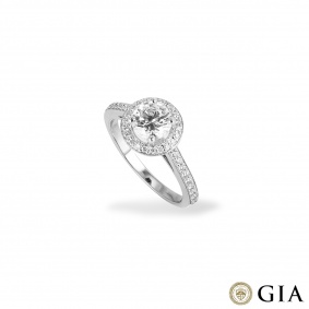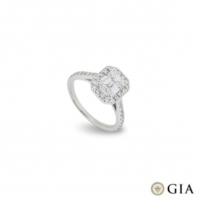 A beautiful platinum diamond engagement ring. The ring consists of a cushion cut diamond in the centre weighing 0.92ct F colour and VS2 clarity. The ring has a diamond halo and diamond set shoulders totalling approximately 0.34ct. The ring is currently a size M and has a gross weight of 5.6 grams.
