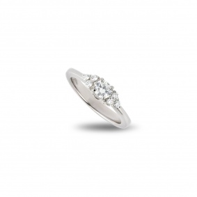 An elegant three stone diamond ring in platinum. The central round brilliant cut diamond weighs 0.37ct, G colour and SI2 clarity. The two pear shape side stones both weigh 0.14ct each well matched in colour and clarity to the central diamond. The ring has a gross weight of 5.20 grams and is currently an L½ but can be adjusted for the perfect fit.