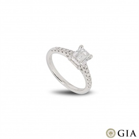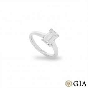 A stunning platinum diamond engagement ring. The solitaire features an emerald cut diamond set in a four prong mount weighing 1.51ct, E colour and VS2 clarity. The ring tapers from 1.5mm to 2.5mm, has a gross weight of 4.51 grams and is currently a size M½ but can be adjusted for the perfect fit.