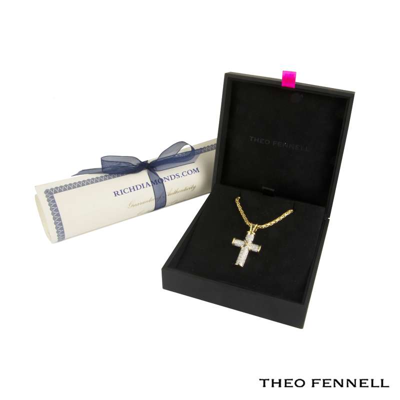 An 18k yellow gold diamond set cross pendant by Theo Fennell. The cross pendant has 59 pave set round brilliant cut diamonds totalling approximately 2.95ct. The cross itself measures 1.5 inches. The bale on the pendant has a clasp to open and close for easy removal of the chain which is signed Theo Fennell and measures 18 inches. The gross weight of the piece is 35.87 grams.
