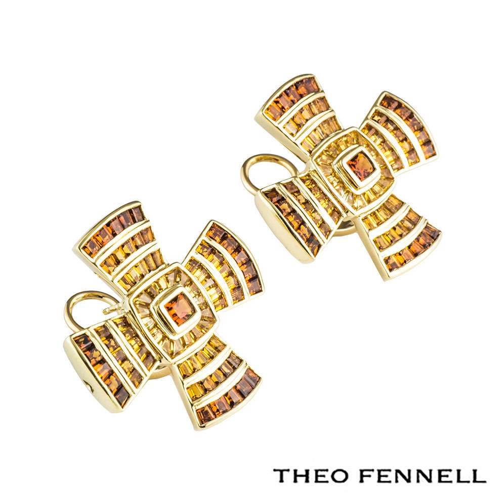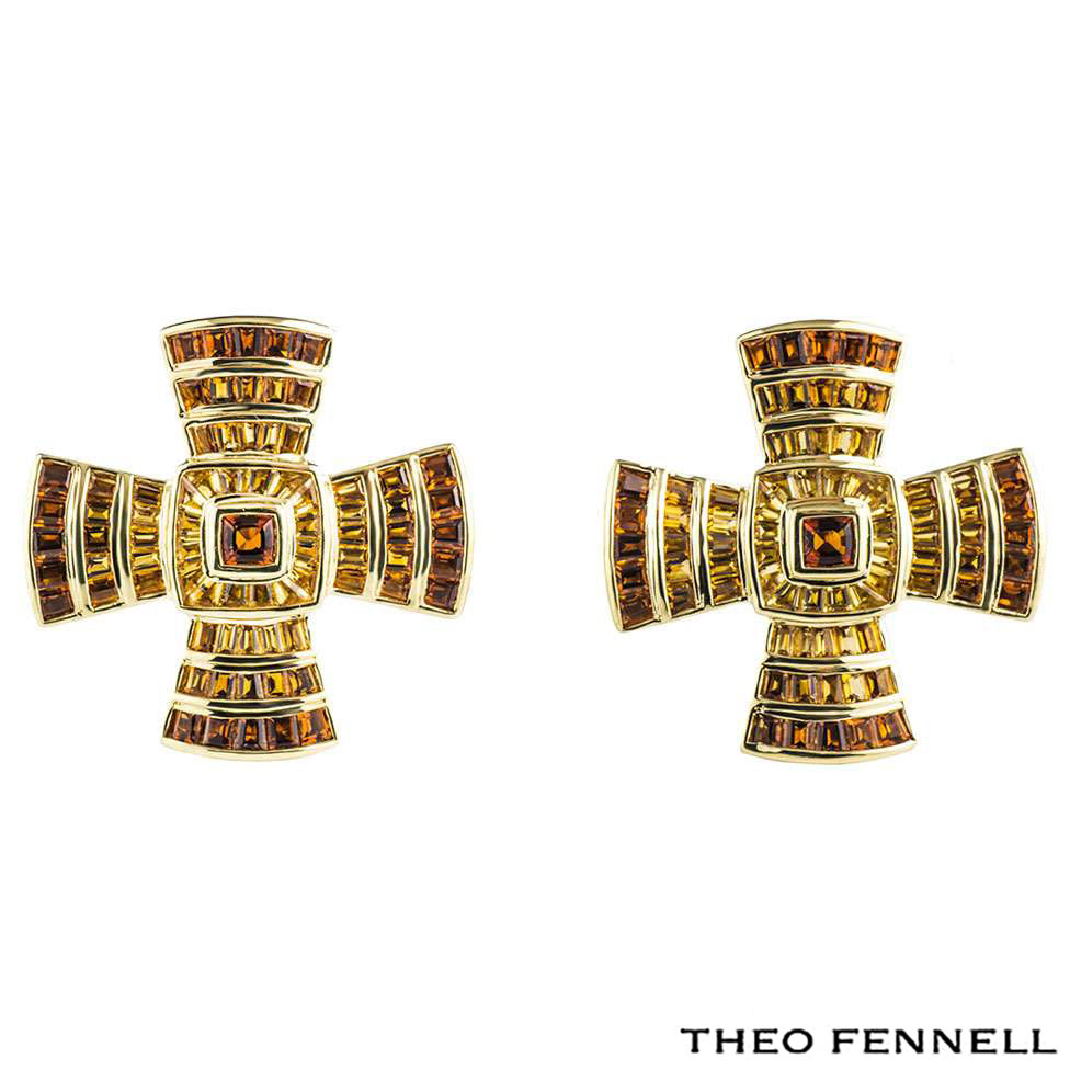A Theo Fennell 18k yellow gold cross earrings. This earrings is a byzantine style cross set with multi-gemstones. There are 77 amethyst gemstones graduating from a deep orange hue to a yellowish-orange hue totalling approximately 3.41ct. The earrings measure 3cm in height and 3cm in width. The earrings come with a post and hinged clip fitting and has a gross weight of 21.6 grams.