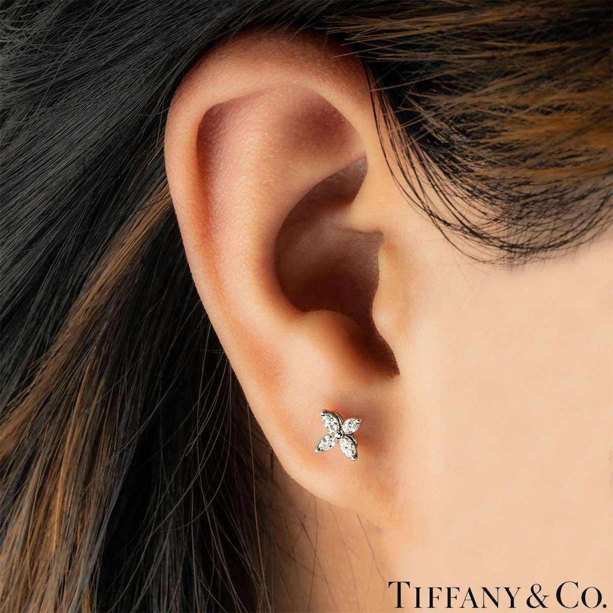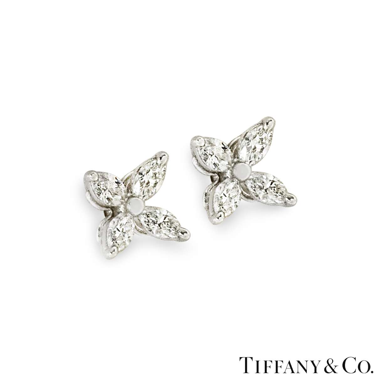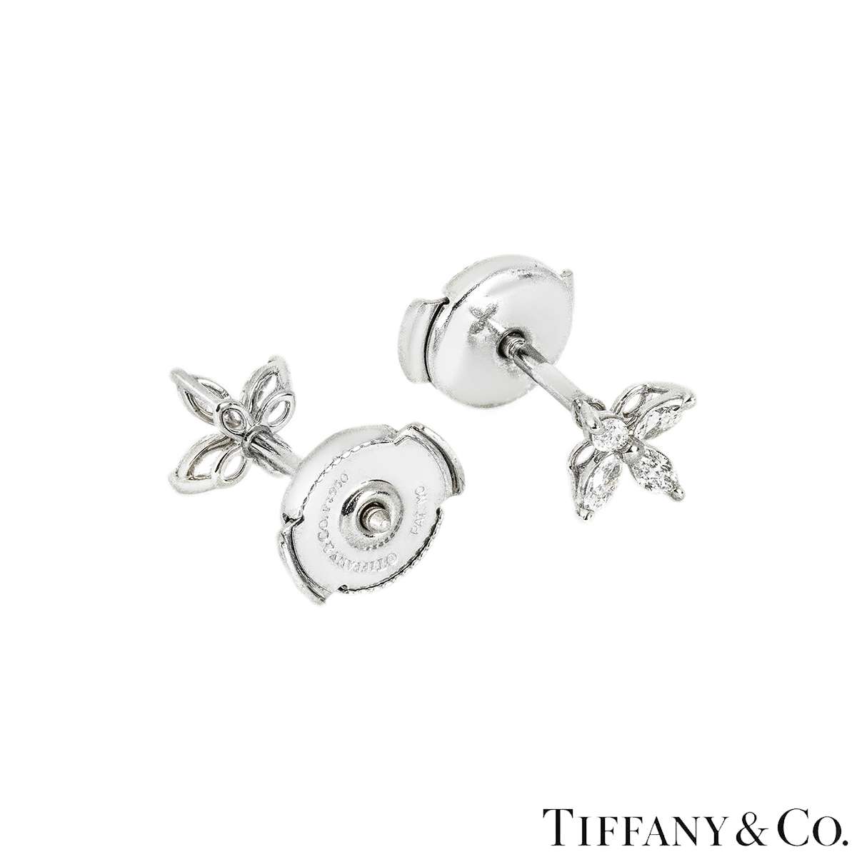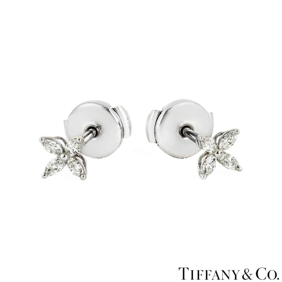 A pair of platinum stud earrings from the Victoria collection by Tiffany & Co. Each earring is set with 4 marquise cut diamonds in a claw setting, with a total weight of 0.19ct. The earrings feature post and alpha back fittings and are the mini size. The earrings have a gross weight of 2.4 grams.