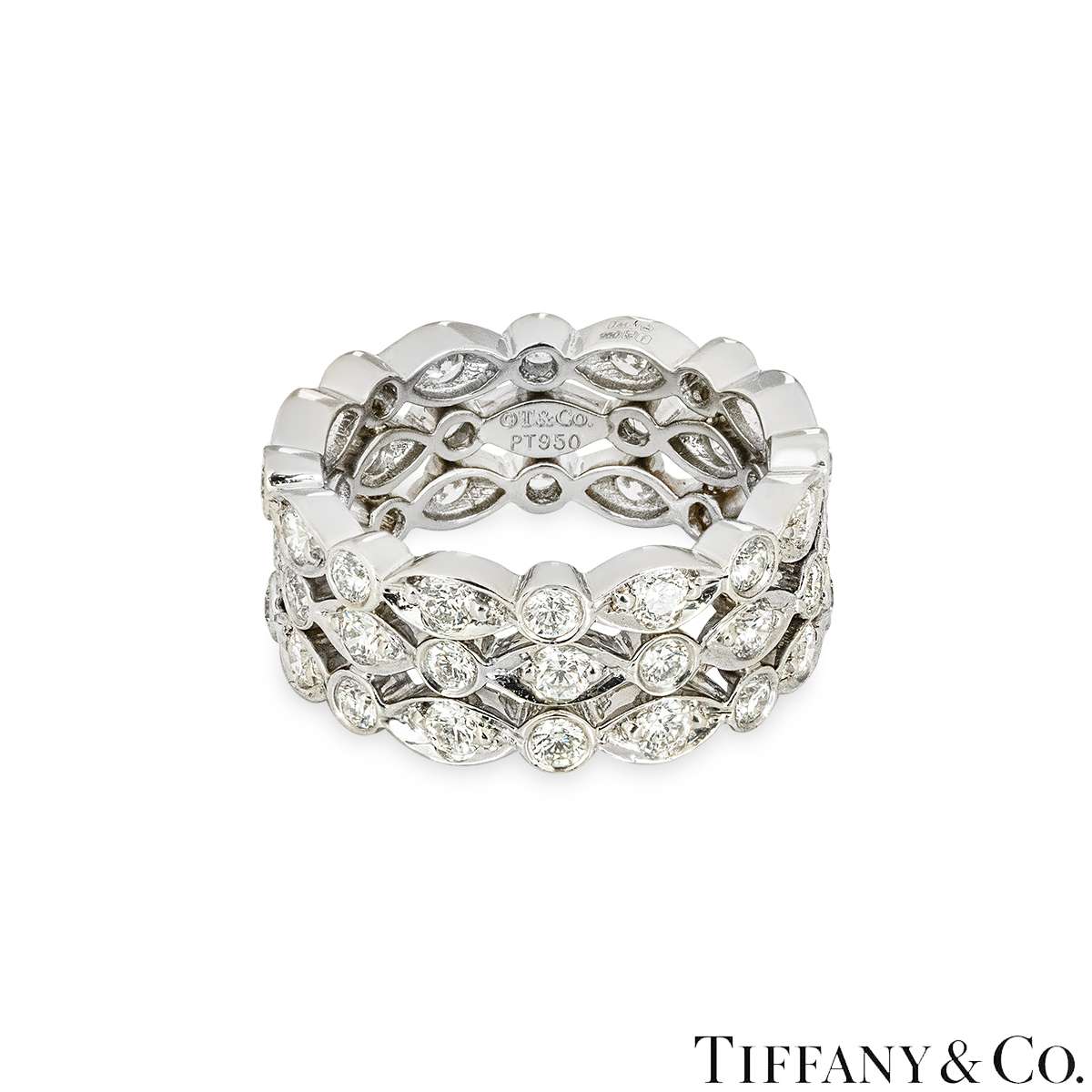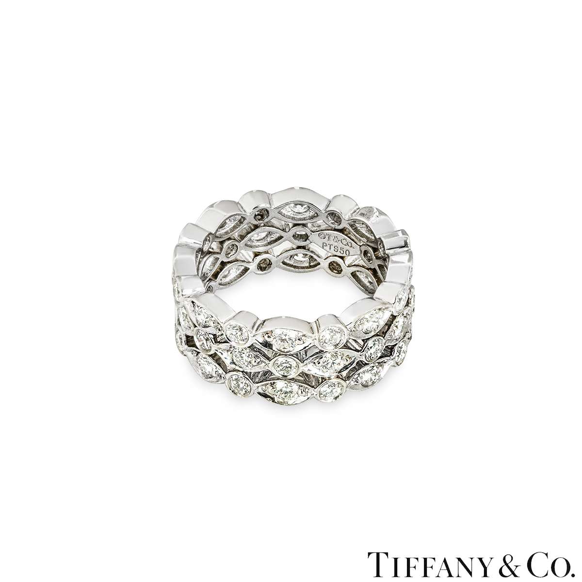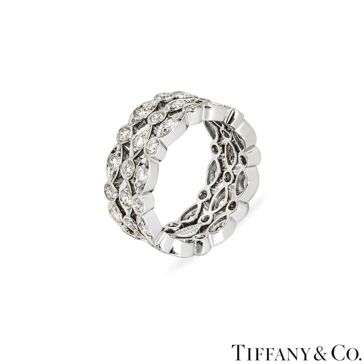 A beautiful platinum diamond ring by Tiffany & Co. from the Jazz collection. The ring measures 7.5mm in width and is made up of three rows of both round and marquise illusion set diamonds. There is a total of 48 round brilliant‑cut diamonds, comprising of 24 claw‑set diamonds with an approximate total weight of 0.72ct and 24 bezel‑set diamonds with an approximate total weight of 0.60ct, giving a combined total diamond weight of approximately 1.32ct, all well matched for colour and clarity. The ring is a size I½ and has a gross weight of 7.9 grams.