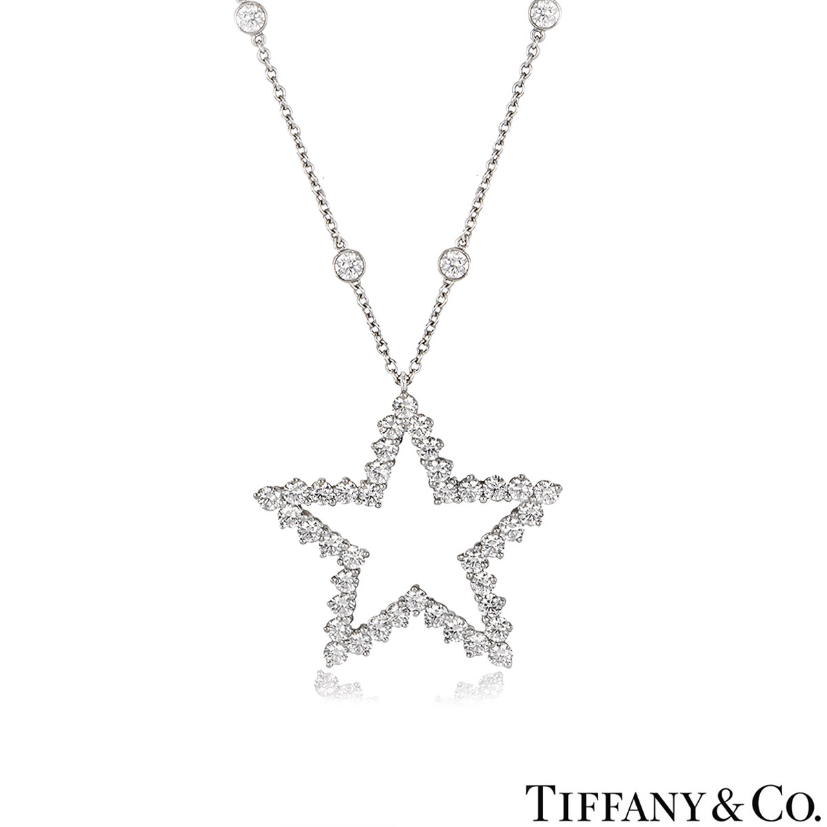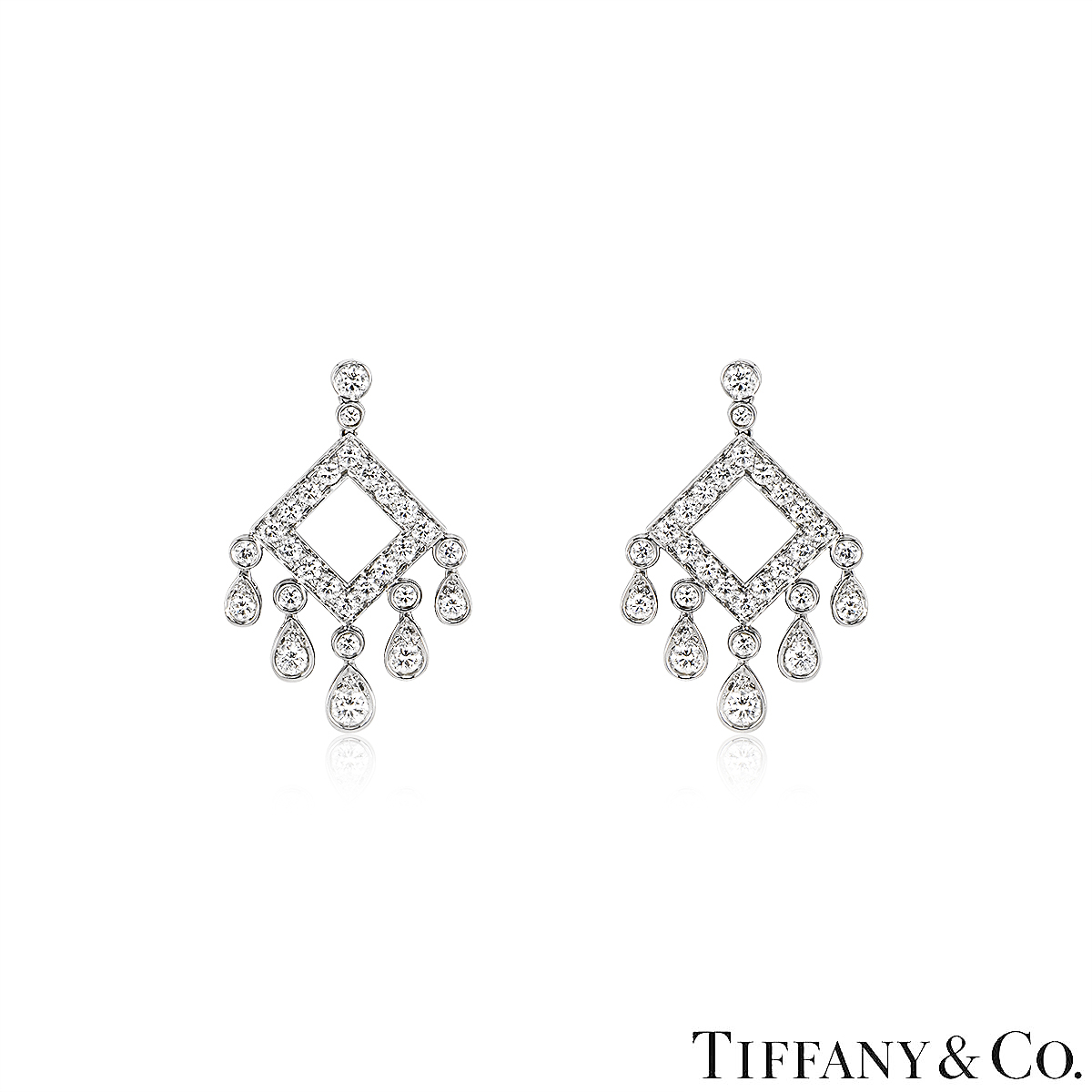 A sparkly pair of platinum diamond earrings by Tiffany & Co. from the Legacy collection. The earrings are set to the top with two graduating round brilliant cut diamonds leading to an openwork kite motif with a freely moving smaller kite motif in the centre. The kite motif is further accentuated with five tassels consisting of round brilliant cut diamonds leading to freely moving pear cut diamonds. The 114 diamonds have an approximate total weight of 5.34ct, F-G colour and VS clarity. The earrings measure 37mm in length and 22mm in width, finish with post and alpha back fittings and have a gross weight of 15.02 grams.