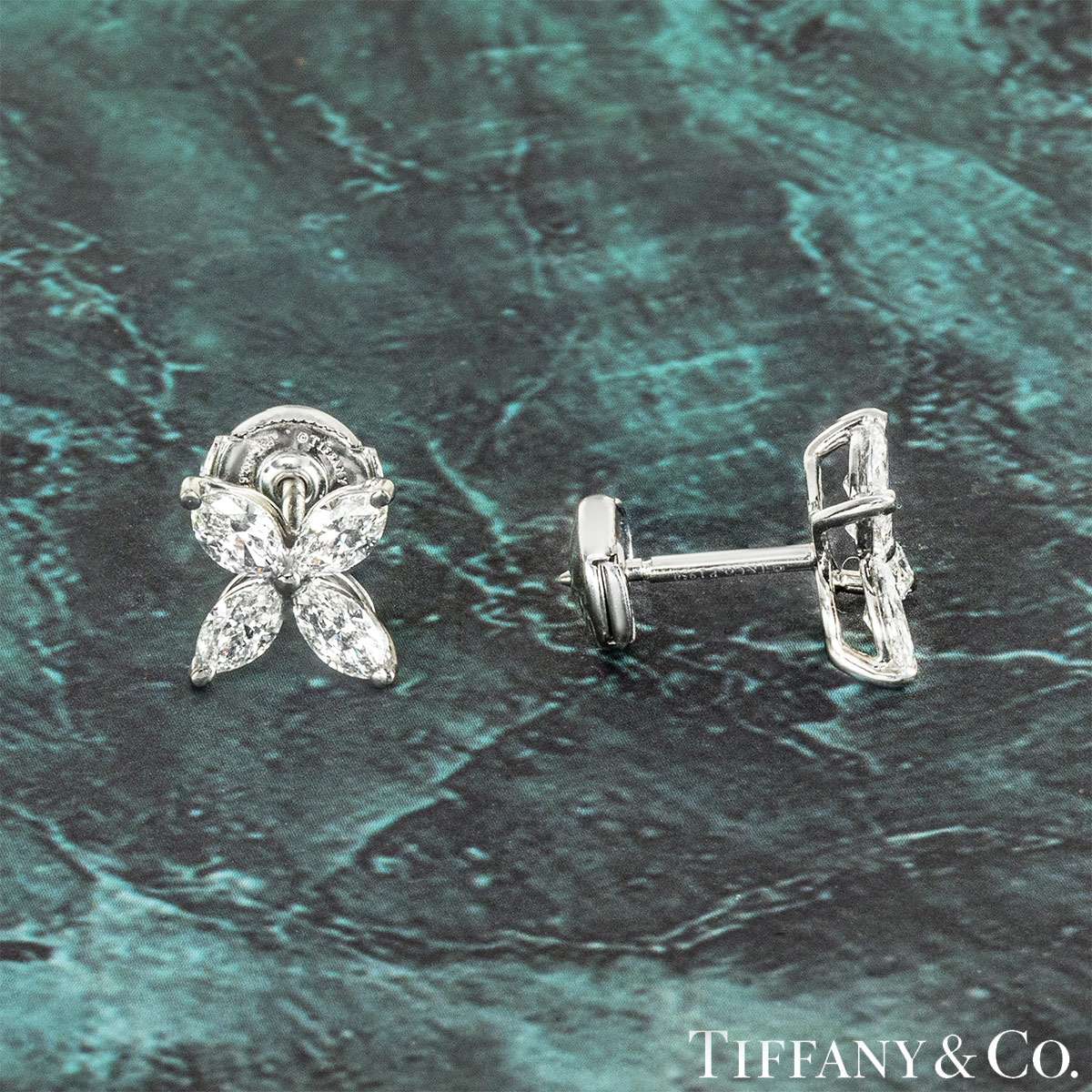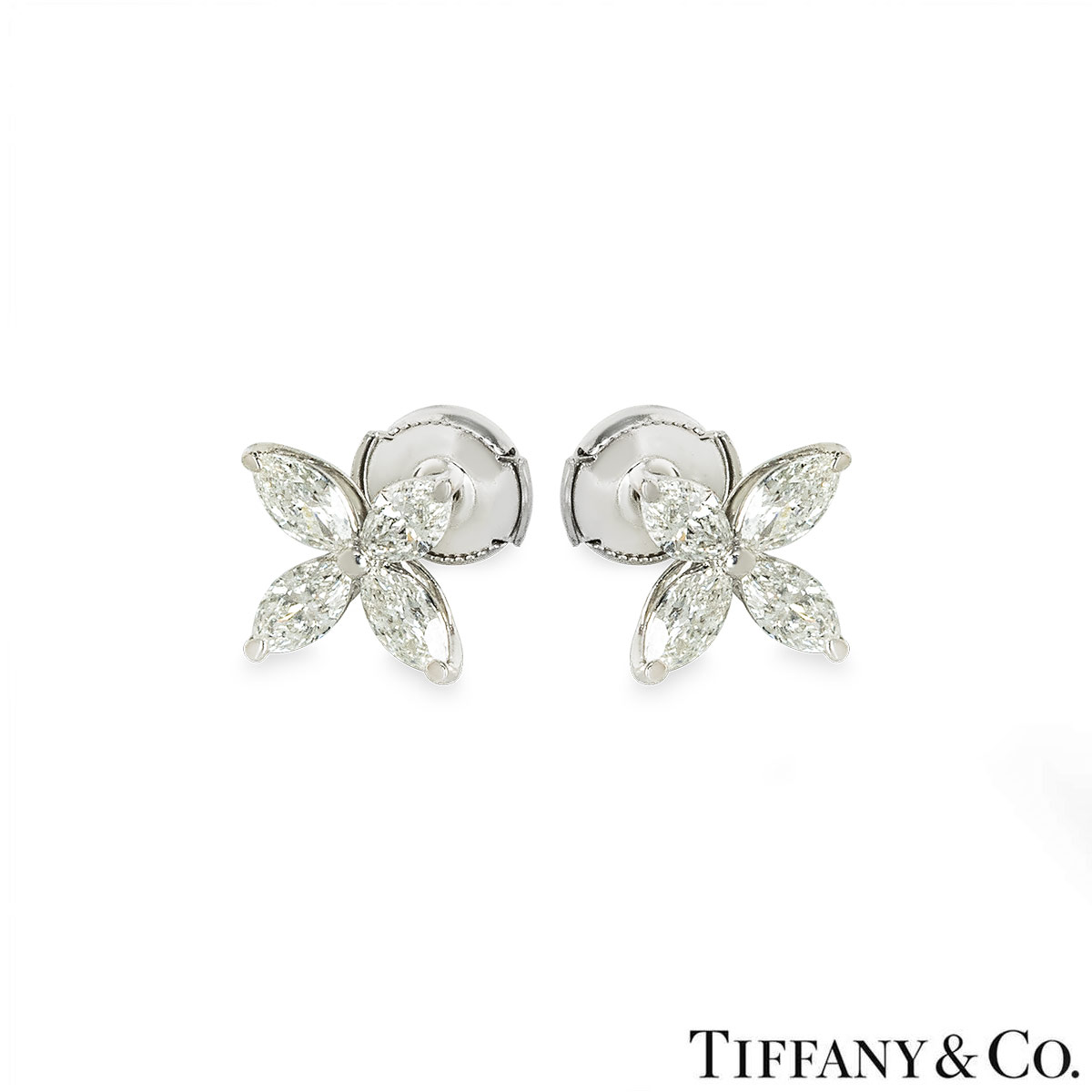 A pair of platinum earrings from the Victoria collection by Tiffany & Co. Each earring is set with 4 marquise cut diamonds in a claw setting. The earrings consist of 8 marquise cut diamonds with a total weight of approximately 1.62ct, D-G colour range and internally flawless to VS1 clarity range. The earrings are the large size model, they feature post and alpha back fittings and have a gross weight of 4.3 grams.