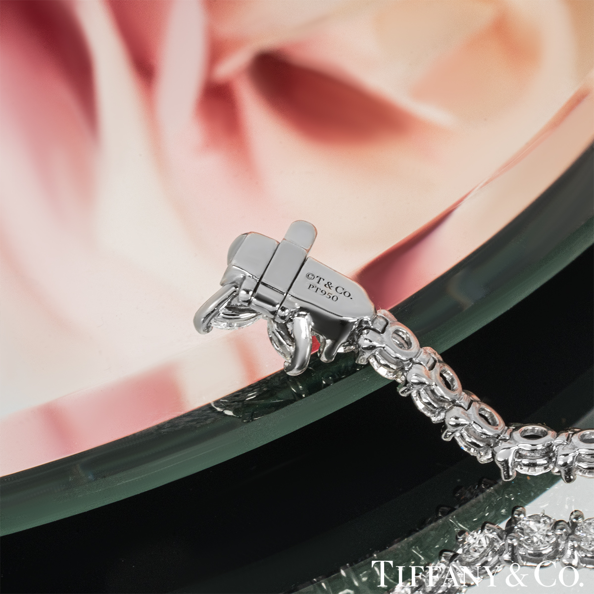 A radiant platinum diamond tennis bracelet by Tiffany & Co. from the Tiffany Victoria collection. The line bracelet is set with 54 round brilliant cut diamonds leading to a diamond clasp set with 4 marquise cut diamonds with an approximate combined total weight of 3.08ct, E-F colour and VVS-VS clarity. The 3mm wide bracelet fits a wrist size up to 7 inches, finishes with a push clasp with an added foldover clasp for extra security and has a gross weight of 12.43 grams.