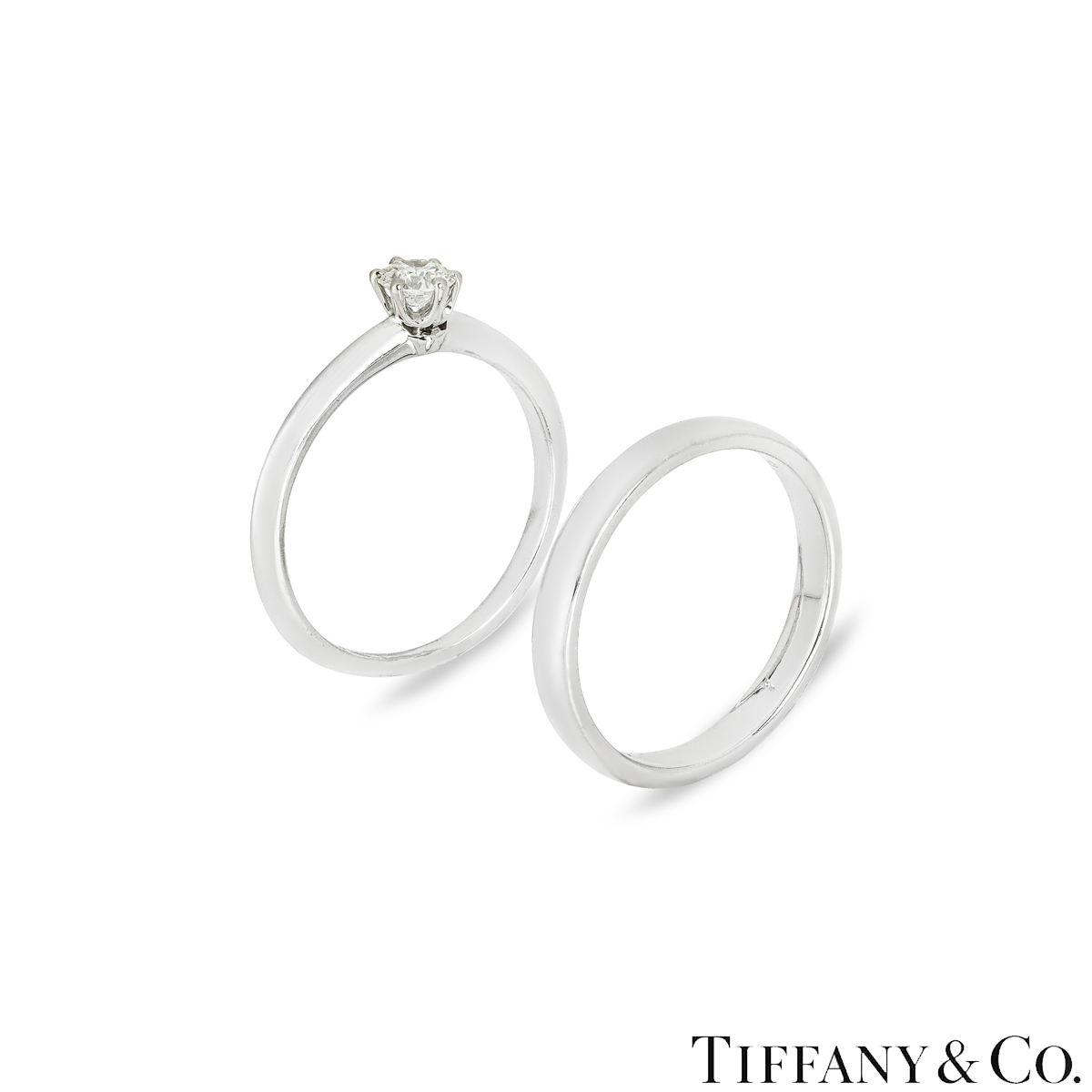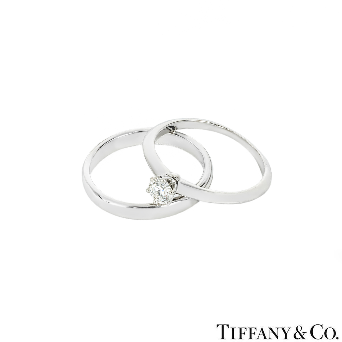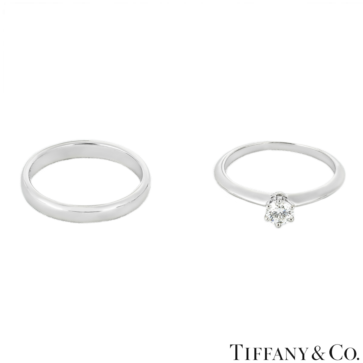 A beautiful platinum diamond bridal set by Tiffany & Co. The set consists of a diamond engagement ring and a polished band. The engagement ring is from the classic setting collection - set to the centre with a 0.31ct round brilliant cut diamond cut diamond in a classic four claw setting, G colour and IF clarity (internally flawless).The polished band is 3mm in width and both rings are currently a size O but can be adjusted for a perfect fit. The bridal set has a gross weight of 8.1 grams.
