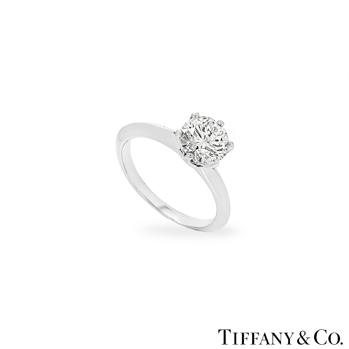 A stunning platinum Tiffany & Co. diamond ring from the Setting collection. The solitaire ring is set to the centre with a round brilliant cut diamond in a classic 6 claw mount, weighing 1.05ct, H colour and VS2 clarity. The 2mm knife edge ring has a gross weight of 4.34 grams and is currently a size J but can be adjusted for a perfect fit.