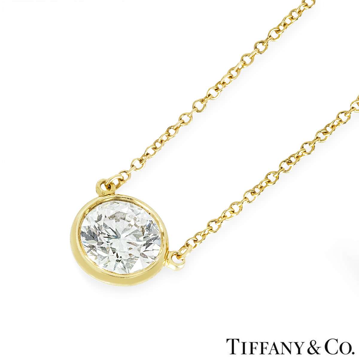 A beautiful yellow gold diamond pendant by Tiffany & Co. from the Elsa Peretti Diamonds By The Yard collection. The pendant features a bezel set round brilliant cut diamond weighing 1.20ct, H colour and VVS1 clarity. The diamond scores an excellent rating in all three aspects for cut, polish and symmetry- this is known as a 'triple excellent' diamond. The pendant is suspended from a 16 inch chain, finishes with a spring ring clasp and has a gross weight of 2.3 grams.
