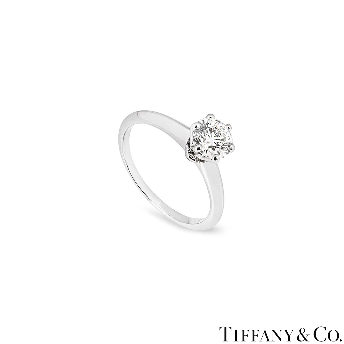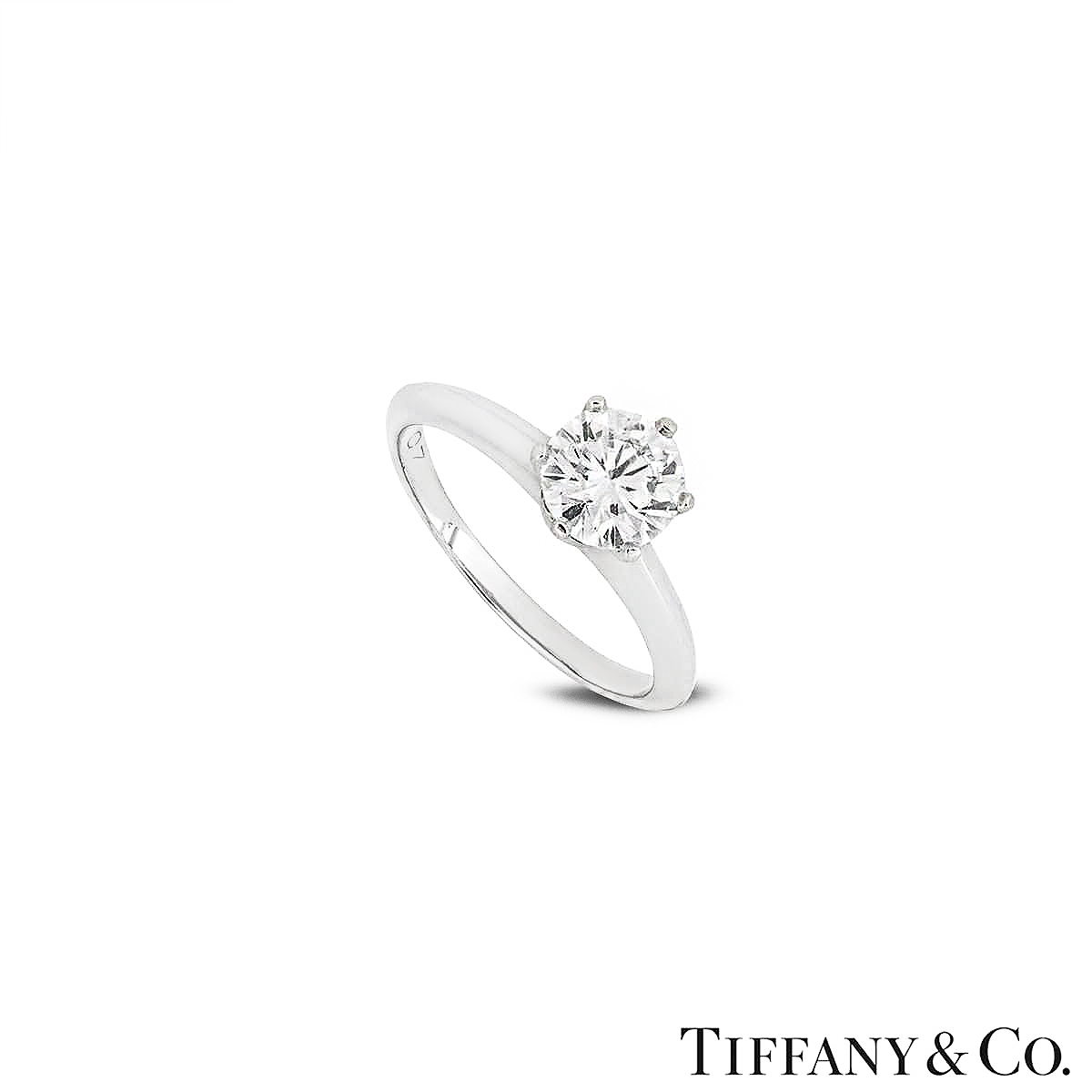 A beautiful platinum diamond ring by Tiffany & Co. from The Setting collection. The ring comprises of a round brilliant cut diamond in a 6 claw setting with a weight of 1.01ct, E colour and VS1 clarity. The ring has a gross weight of 4.2 grams and is currently a size I½ but can be adjusted for a perfect fit.