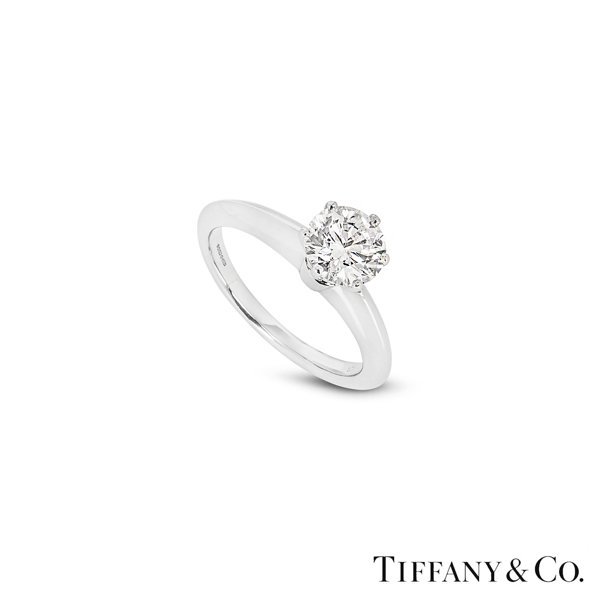 A stunning platinum diamond solitaire ring by Tiffany & Co. from the Setting collection. The solitaire features a round brilliant cut diamond set to the centre in a 6 claw mount weighing 1.11ct, D colour and VS1 clarity. The diamond scores an excellent rating in all three aspects for cut, polish and symmetry - this is known as a 'triple excellent' diamond. The ring has a gross weight of 4.34 grams and is currently a size M but can be adjusted for the perfect fit.