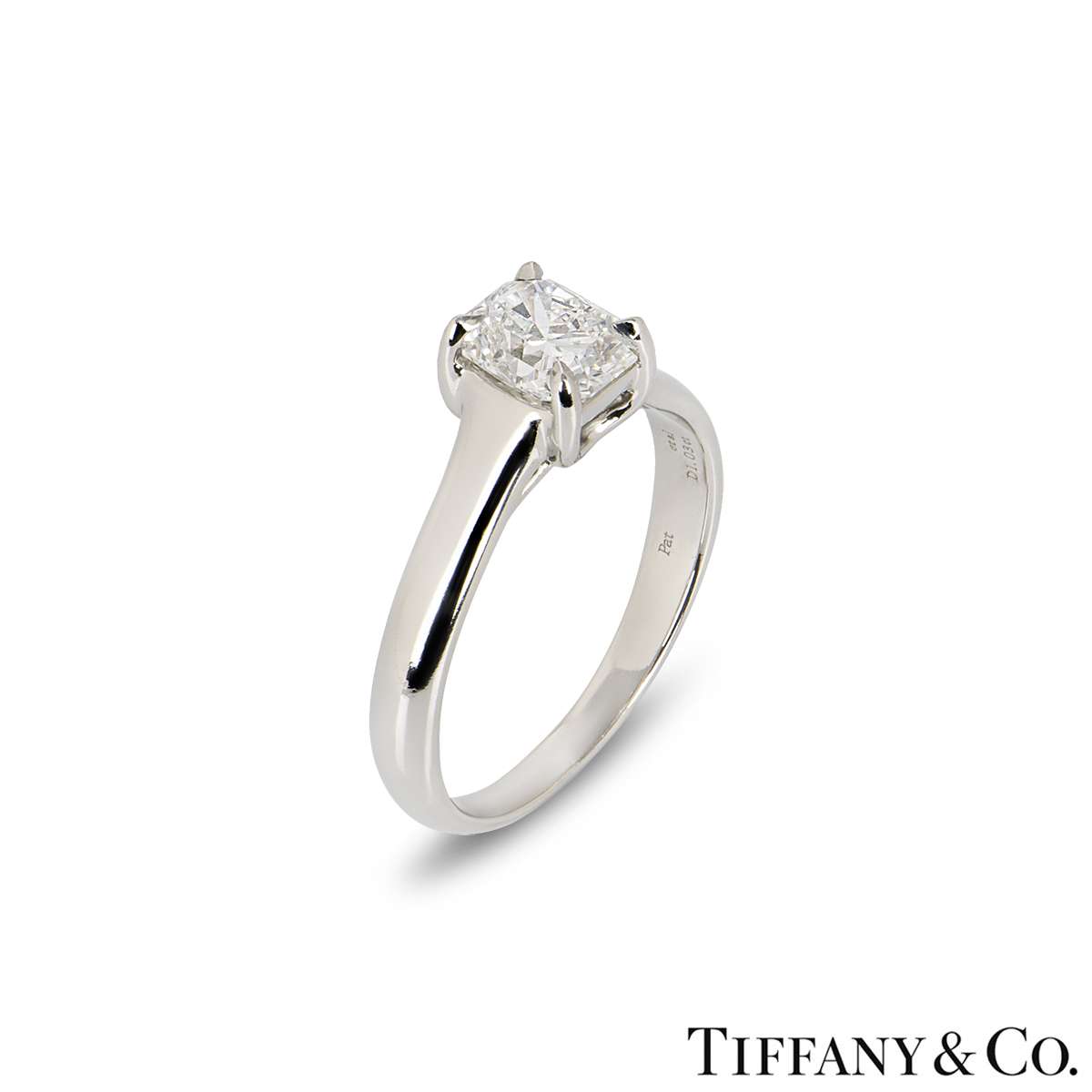 A beautiful platinum diamond ring from the Lucida collection by Tiffany & Co. The solitaire ring features a single Lucida cut diamond in a four claw mount, weighing 1.03ct, F colour and VVS2 clarity. The ring is currently a size M½ but can be adjusted for a perfect fit and has a gross weight of 4.8 grams.