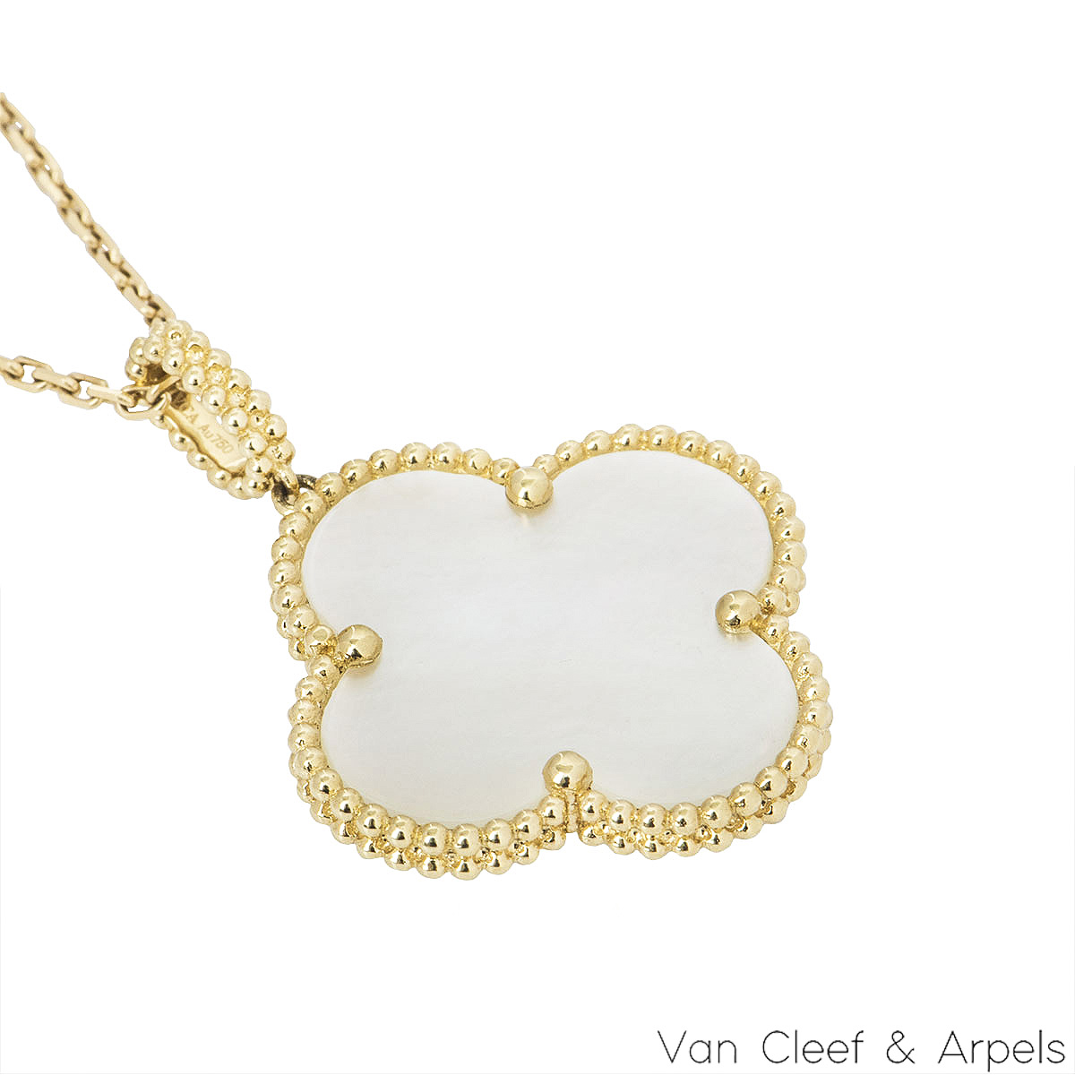 An iconic 18k yellow gold Van Cleef & Arpels pearl necklace from the Magic Alhambra collection. The necklace comprises of the iconic Alhambra 4 leaf clover motif with an inlay of mother of pearl, complemented with a beaded edge. The necklace features an adjustable 35.43 inch rectangular trace link chain with lobster clasp fitting and loop. The motif has a length and width of 2.60cm with a gross weight of 16.10 grams.