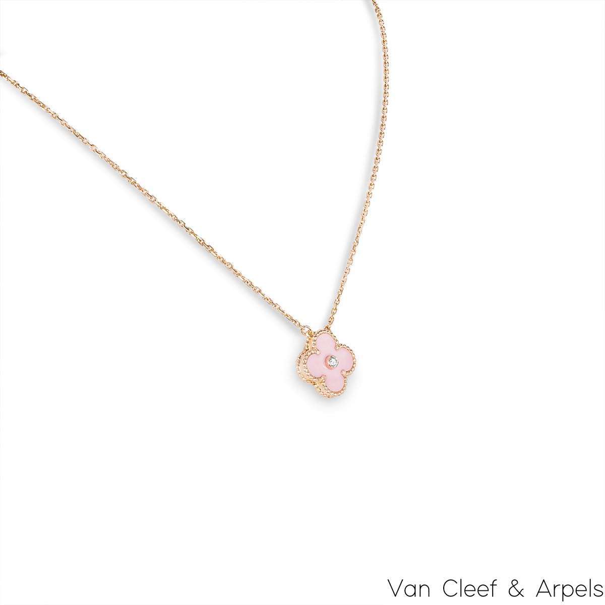A limited edition 18k rose gold pink porcelain and diamond Van Cleef & Arpels Vintage Alhambra pendant, from the 2015 Holiday collection. The pendant features the iconic beaded edge 4-leaf clover motif with a Pink Sèvres porcelain inlay. Van Cleef & Arpels perfected the 20-step technique to create a beautifully finished porcelain inlay over 250 years ago. Complementing the inlay is a single bezel set round brilliant cut diamond, weighing approximately 0.05ct. The motif itself measures 1.5cm in width and suspends from an adjustable 14-16 inch chain. The pendant finishes with the new style lobster hallmark clasp and has a gross weight of 6.7 grams.