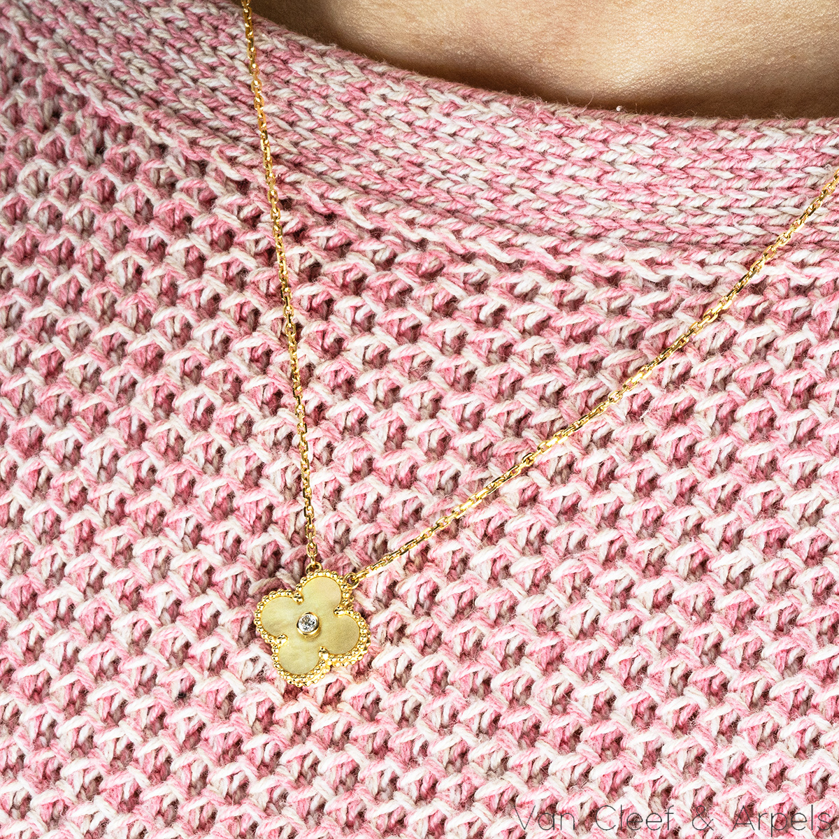 A limited edition 18k yellow gold mother of pearl and diamond Van Cleef & Arpels Vintage Alhambra pendant from the 2018 Holiday collection. The pendant features a beaded edge 4 leaf clover motif with a light green Celadon Sèvres porcelain inlay. Further complementing the inlay is a single bezel set round brilliant cut diamond, weighing approximately 0.05ct. The iconic motif measures 1.5cm in width and suspends from an adjustable 14-16 inch chain. Finishes with a lobster clasp and has a total gross weight of 6.6 grams.