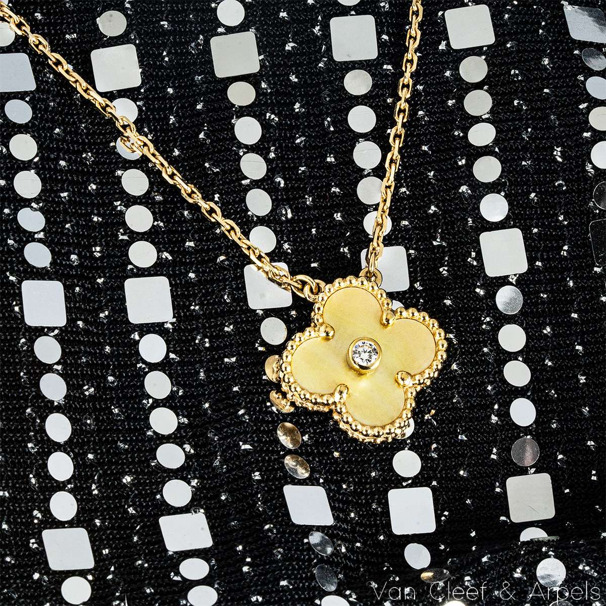 A limited edition 18k yellow gold mother of pearl and diamond Van Cleef & Arpels Vintage Alhambra pendant from the 2018 Holiday collection. The pendant features a beaded edge 4 leaf clover motif with a light green Celadon Sèvres porcelain inlay. Further complementing the inlay is a single bezel set round brilliant cut diamond, weighing approximately 0.05ct. The iconic motif measures 1.5cm in width and suspends from an adjustable 14-16 inch chain. Finishes with a lobster clasp and has a total gross weight of 6.6 grams.
