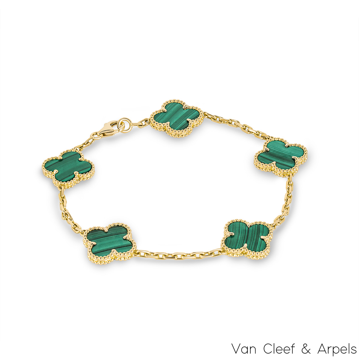 A gorgeous 18k yellow gold malachite bracelet by Van Cleef & Arpels, from their Vintage Alhambra collection. The bracelet features 5 of the iconic 4 leaf clover motifs, each with a beaded edge and a malachite inlay. Measuring 7.5 inches in length, the bracelet finishes with the hallmark lobster clasp and has a gross weight of 12.5 grams.