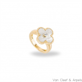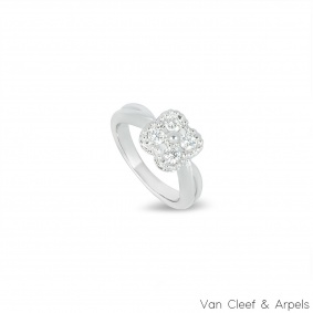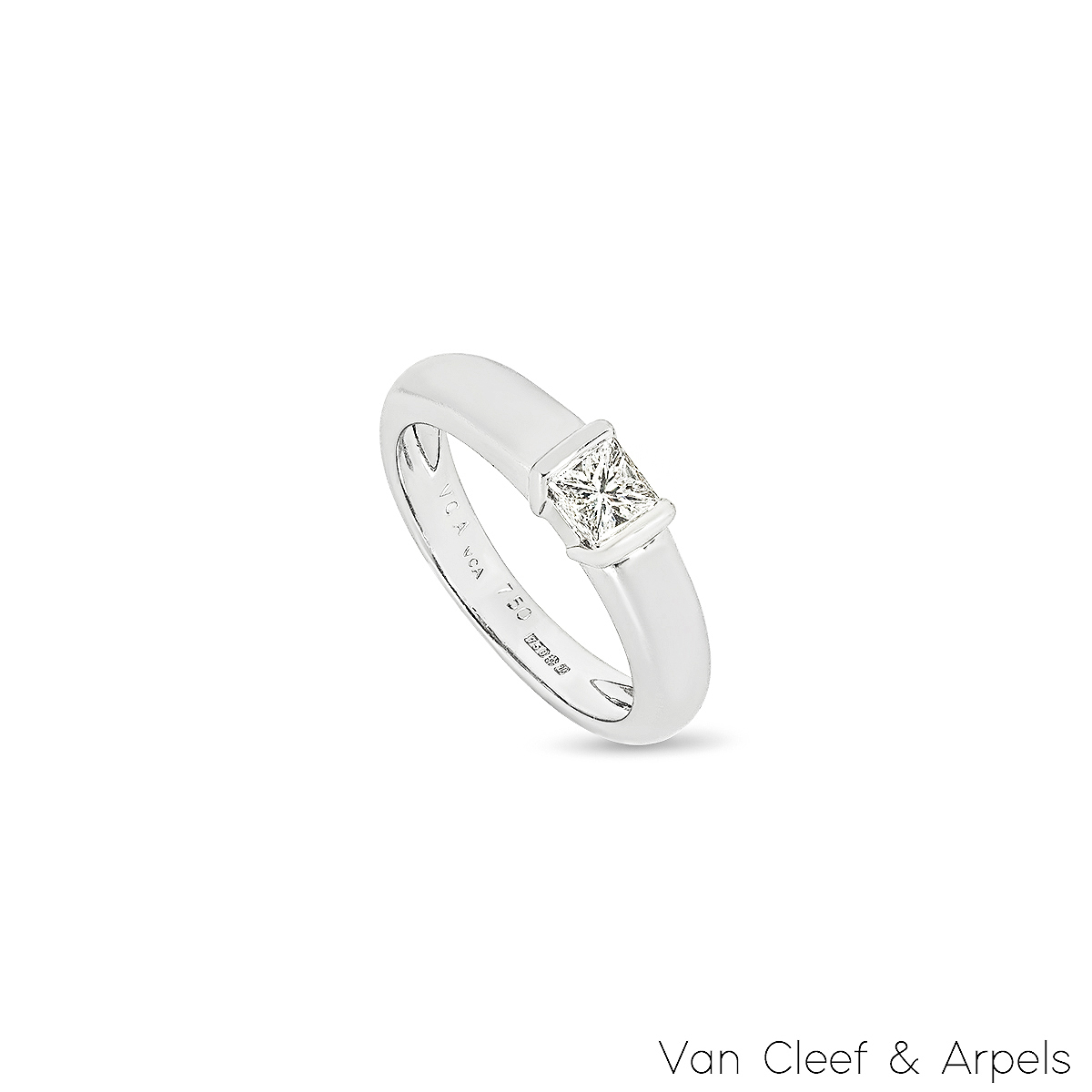 A stunning diamond ring in platinum by Van Cleef and Arpels. The ring is set to the centre with a round brilliant cut diamond in a four claw setting weighing 1.03ct, it is D-E in colour and VS in clarity. The centre stone is complemented by graduating baguette cut diamond shoulders totalling 0.96ct, F-G in colour and VS in clarity. The ring is currently a size K and has a gross weight of 5.84 grams.