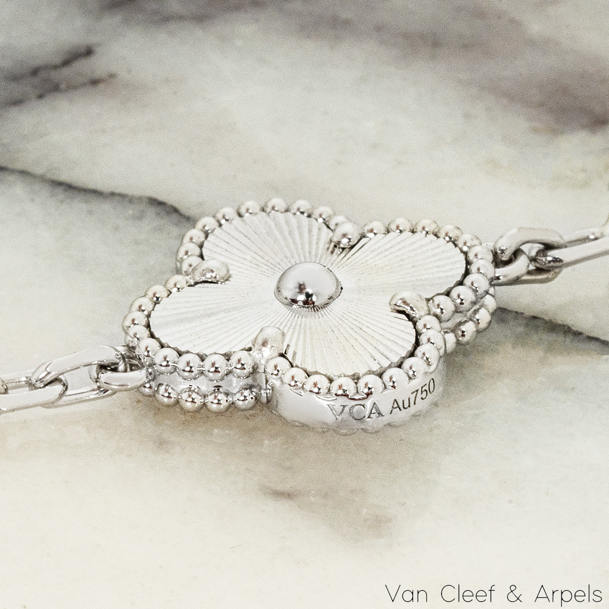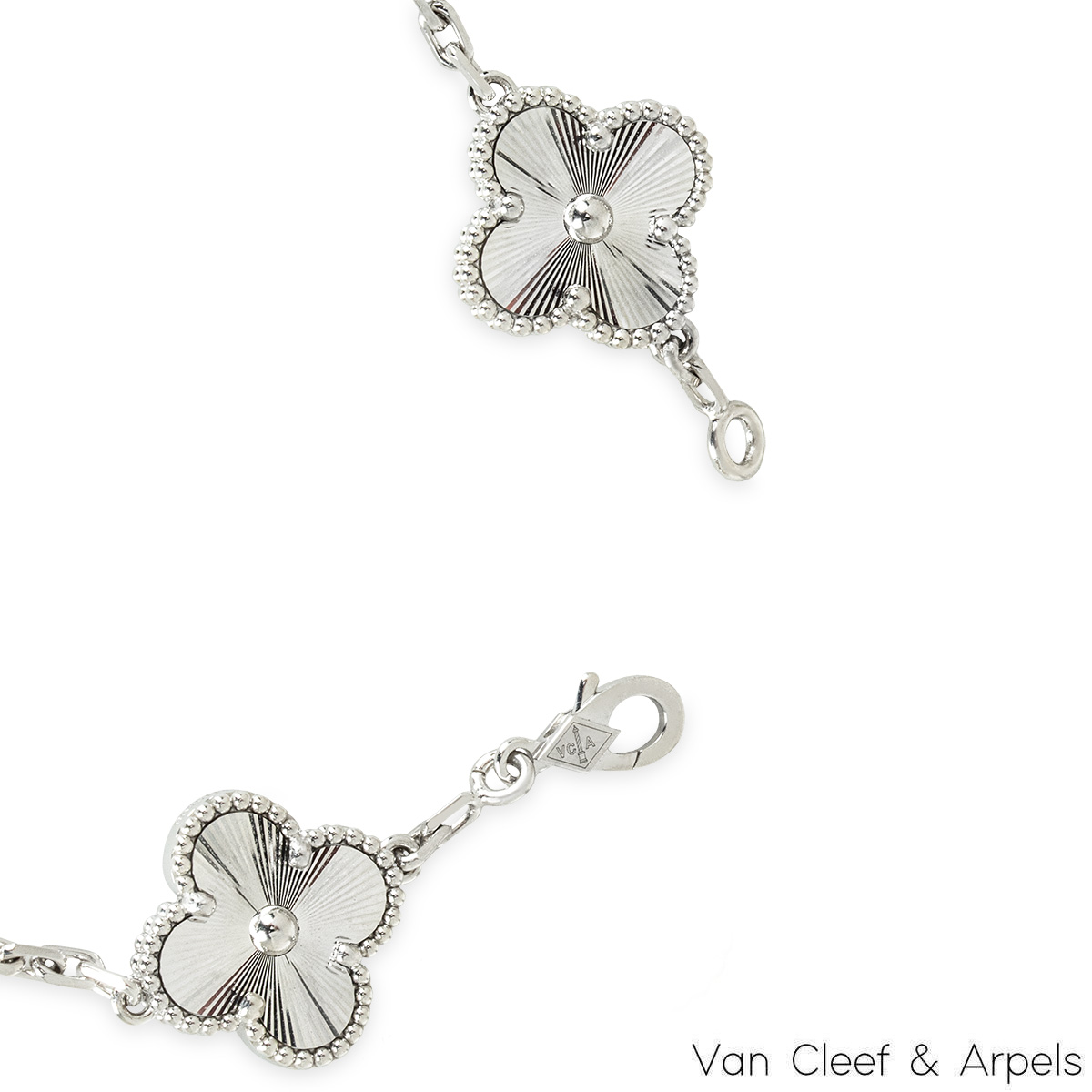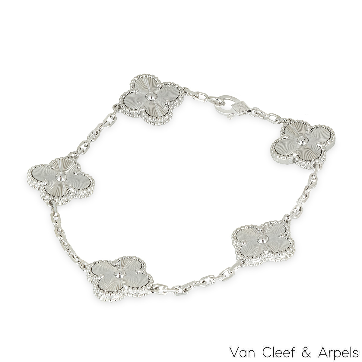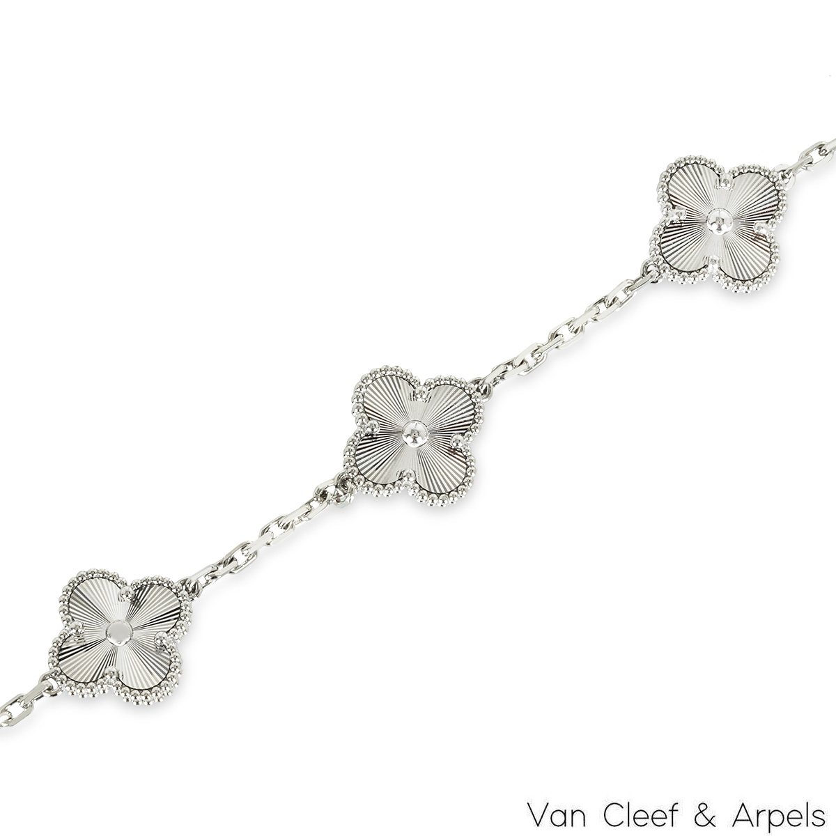 A stunning 18k white gold, guilloche bracelet from the Vintage Alhambra collection by Van Cleef and Arpels. The bracelet is made up of 5 of the iconic clover motifs, each set with a beaded edge and a guilloche inlay. Measuring 7.5 inches in length, the bracelet finishes with a lobster hallmark clasp and has a total gross weight of 23.4 grams.