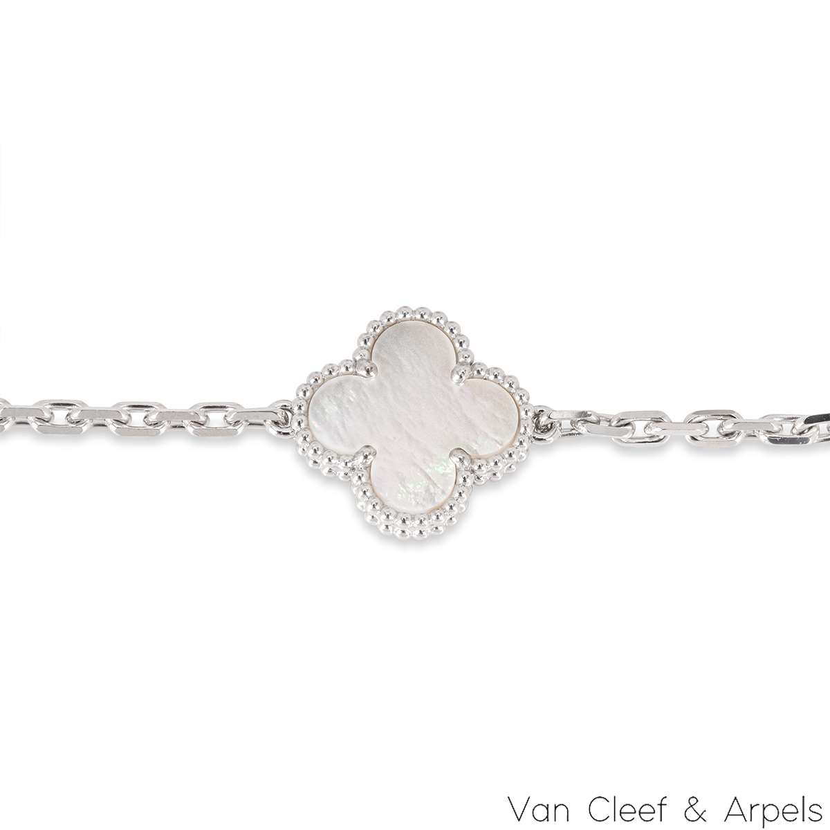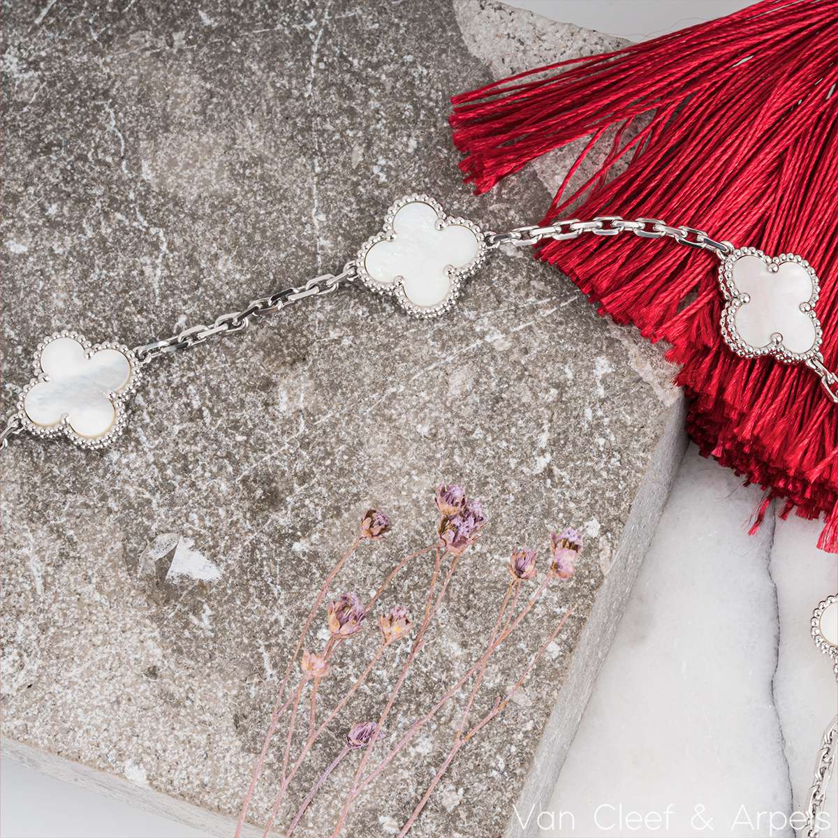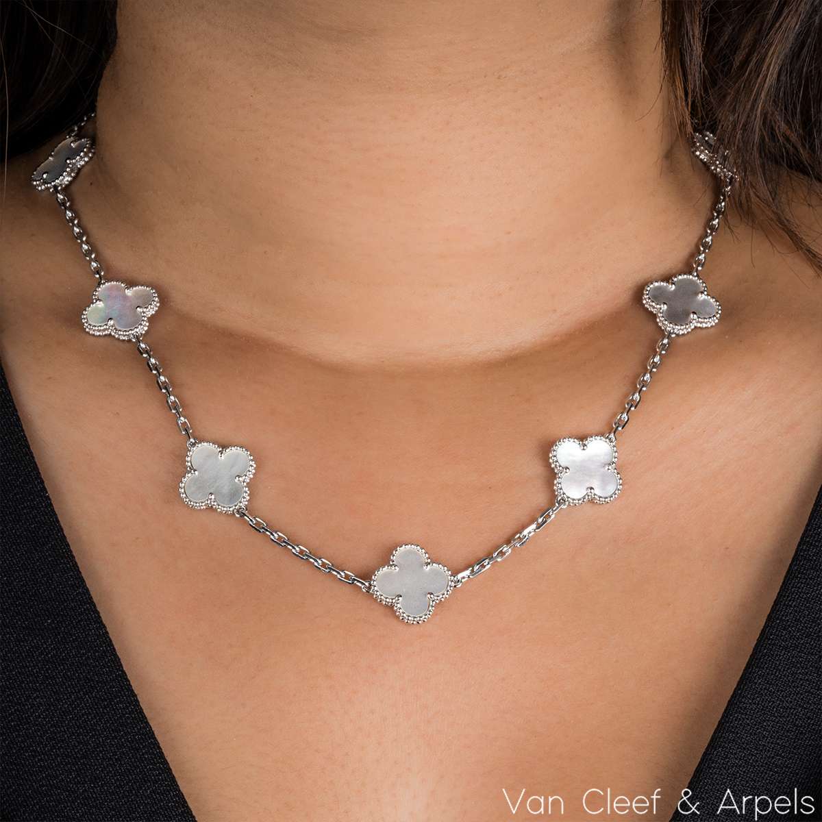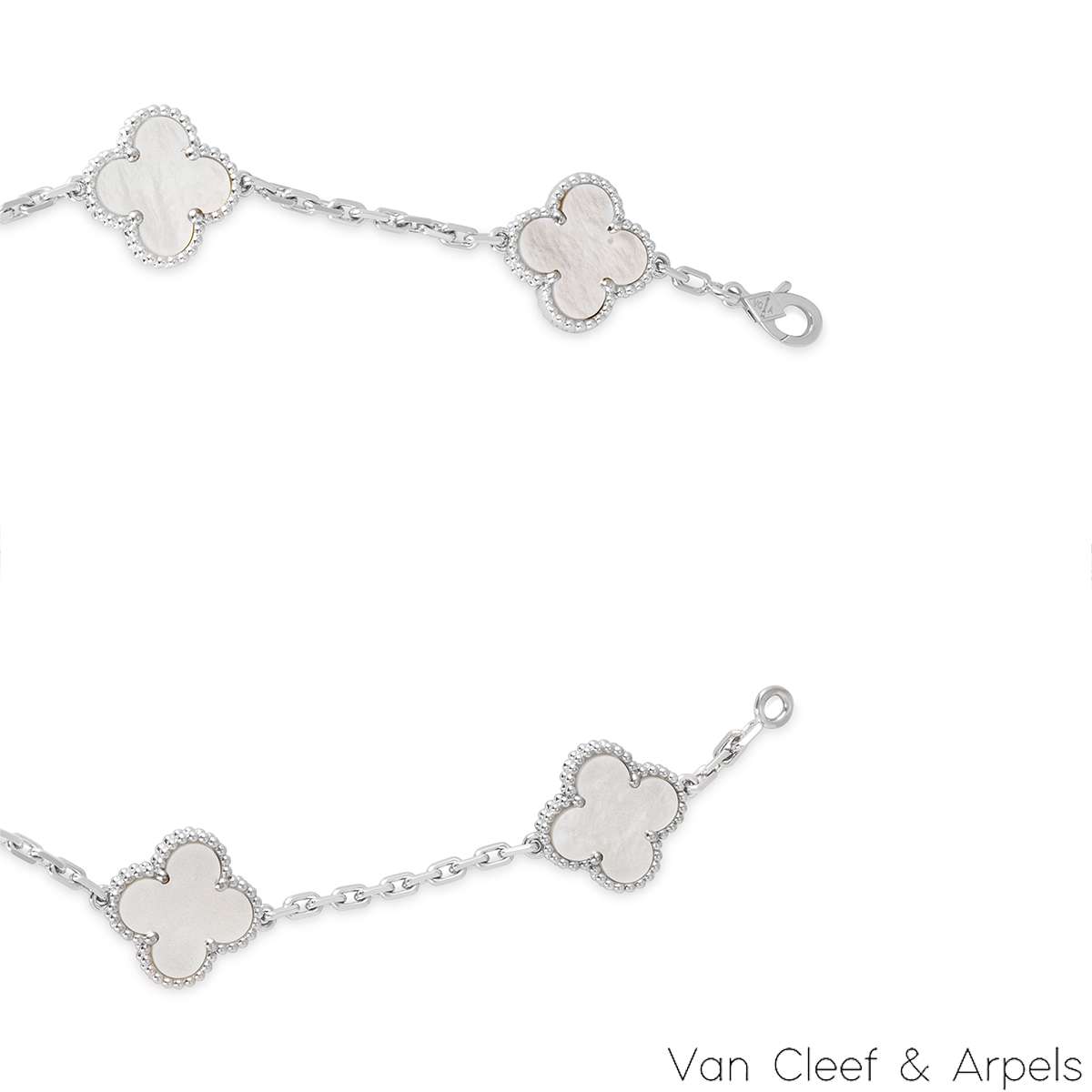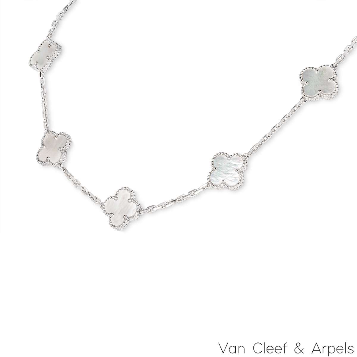 A stunning 18k white gold Vintage Alhambra necklace by Van Cleef & Arpels. The necklace has 10 motifs, each set with a mother of pearl inlay and complemented by a beaded outer edge. The necklace measures 17 inches in length, features a lobster clasp and has a gross weight of 24 grams.