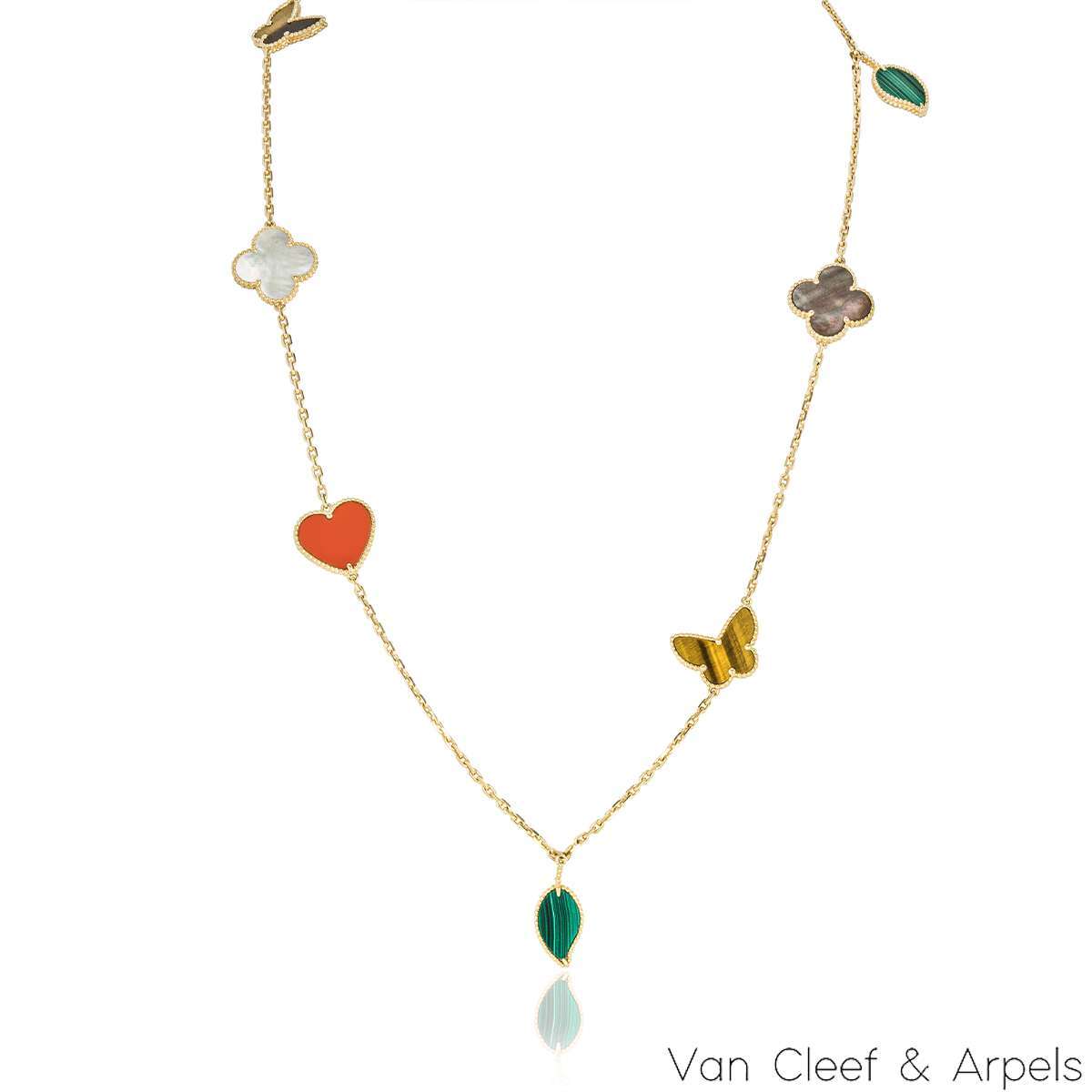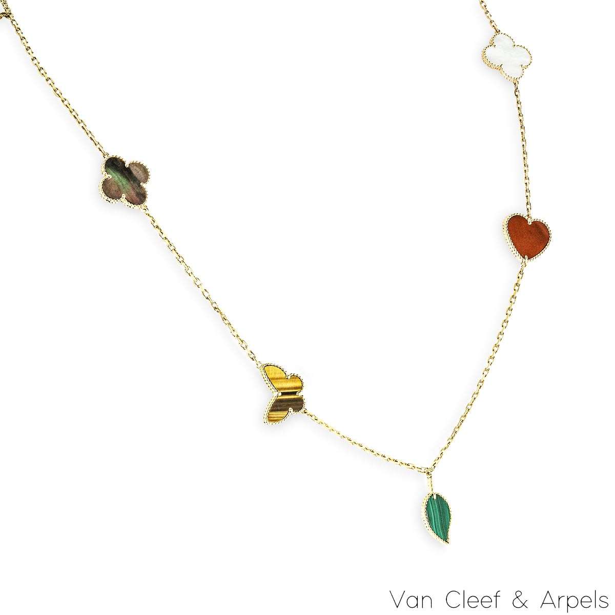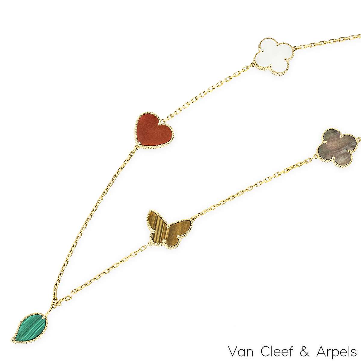 A beautiful 18k yellow gold, Lucky Alhambra long necklace by Van Cleef & Arpels. Features 12 motifs, with a variety of motifs including hearts, butterflies, leaves and the iconic clovers. The motifs are set with carnelian, malachite, mother of pearl and tiger eye. Measuring 35 inches in length, finished with a concealed clasp, the necklace has a gross weight of 45.4 grams.