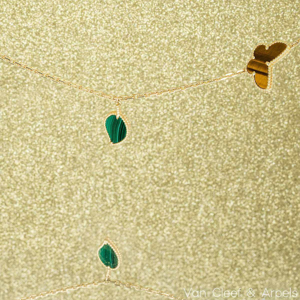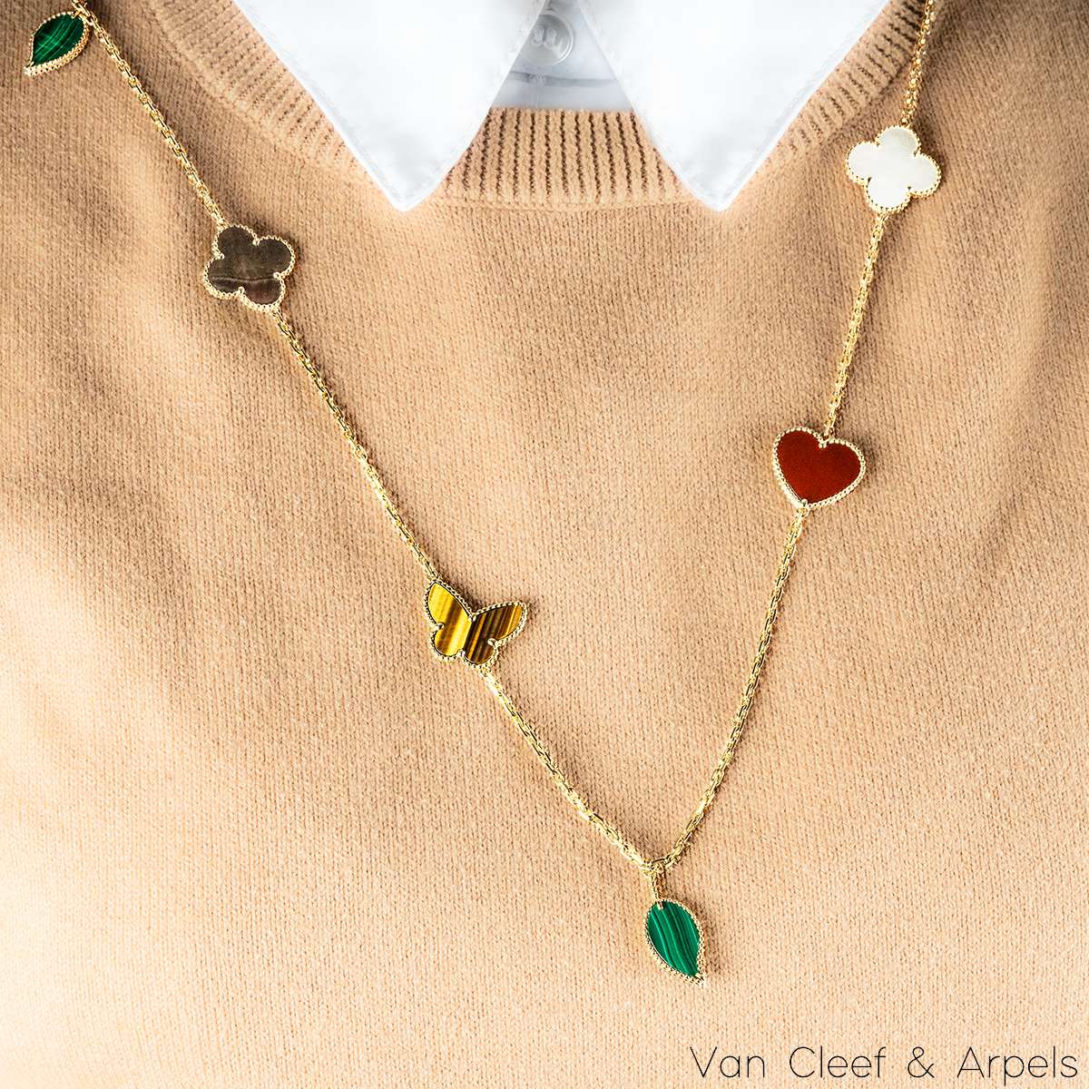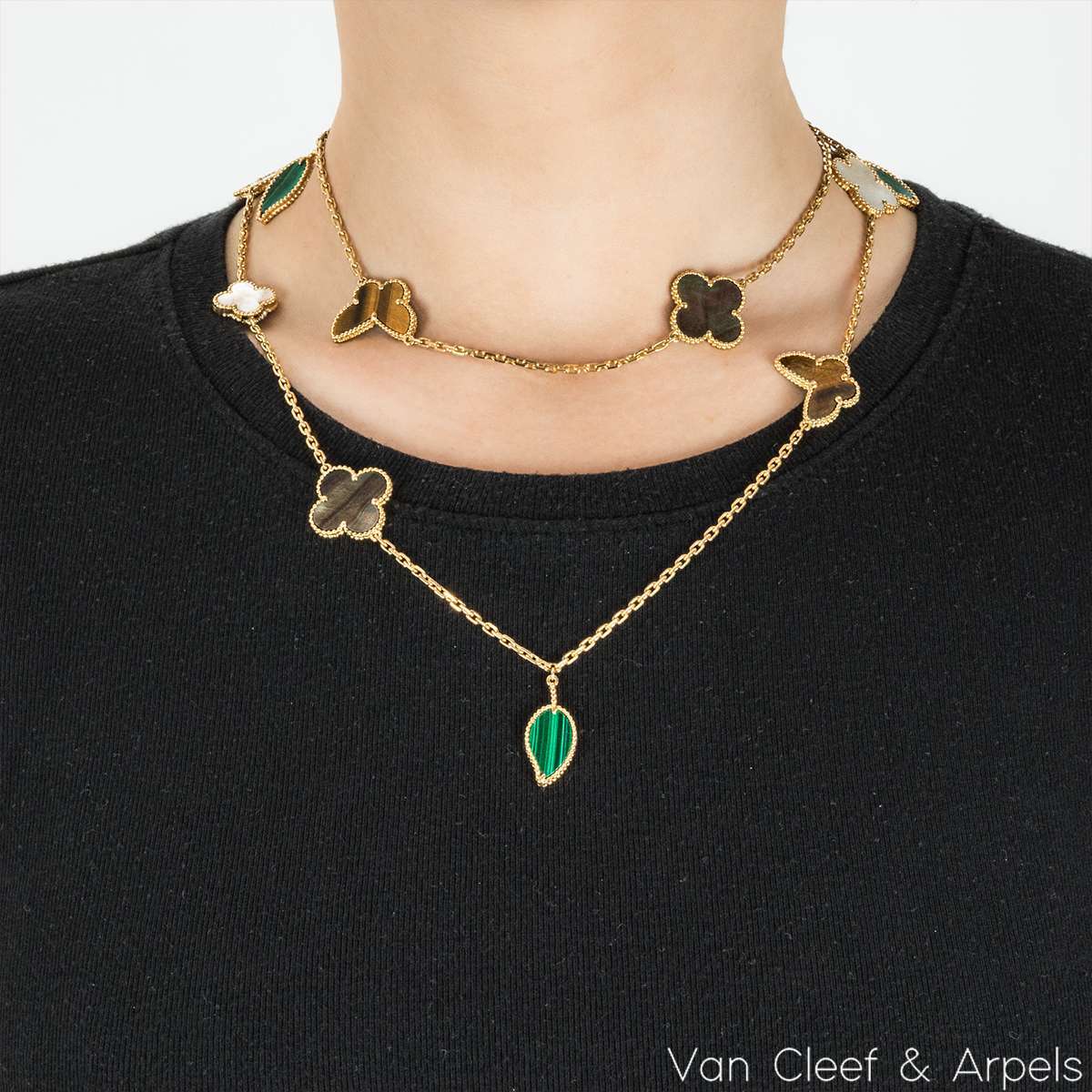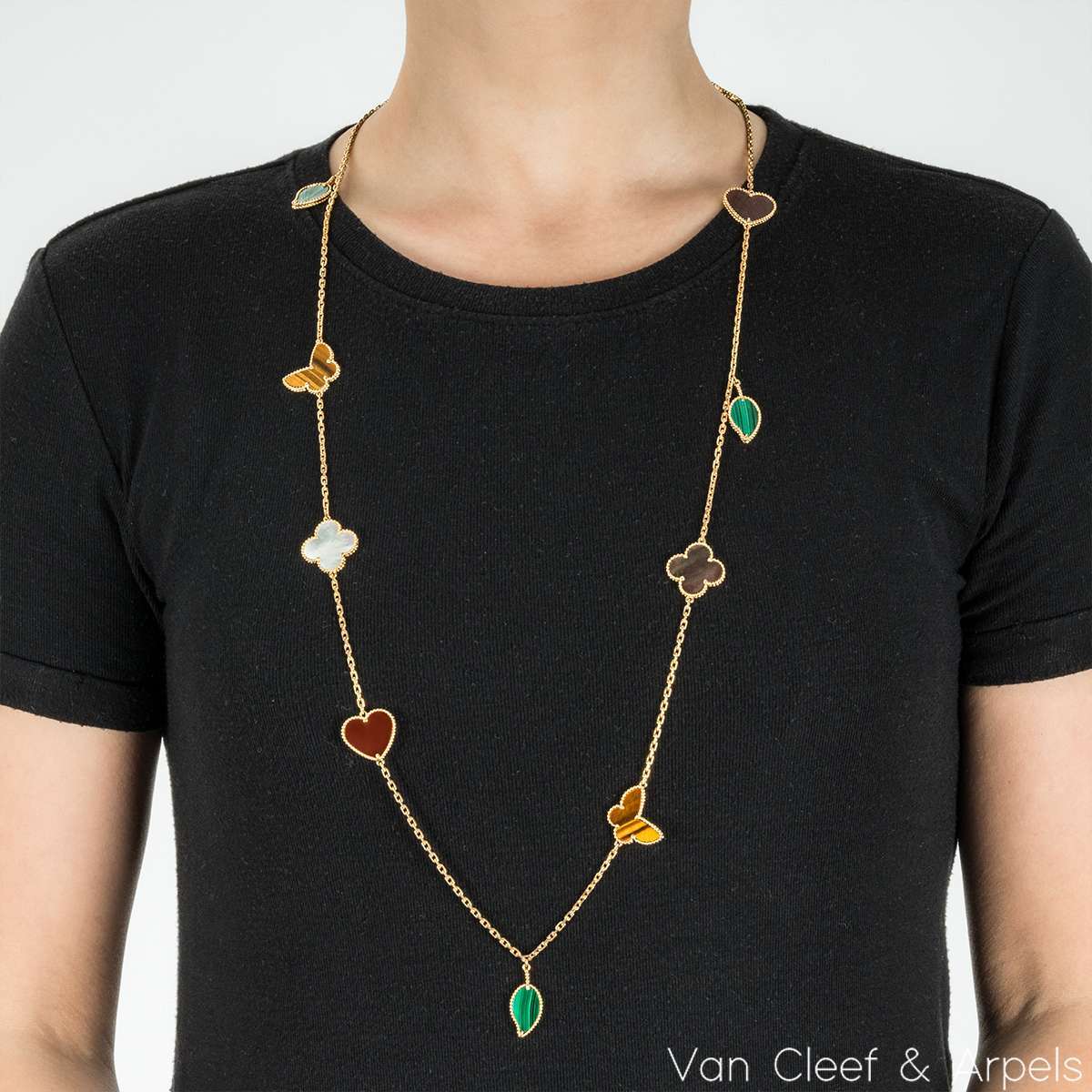 A beautiful 18k yellow gold, Lucky Alhambra long necklace by Van Cleef & Arpels. Features 12 motifs, with a variety of motifs including hearts, butterflies, leaves and the iconic clovers. The motifs are set with carnelian, malachite, mother of pearl and tiger eye. Measuring 35 inches in length, finished with a concealed clasp, the necklace has a gross weight of 45.4 grams.