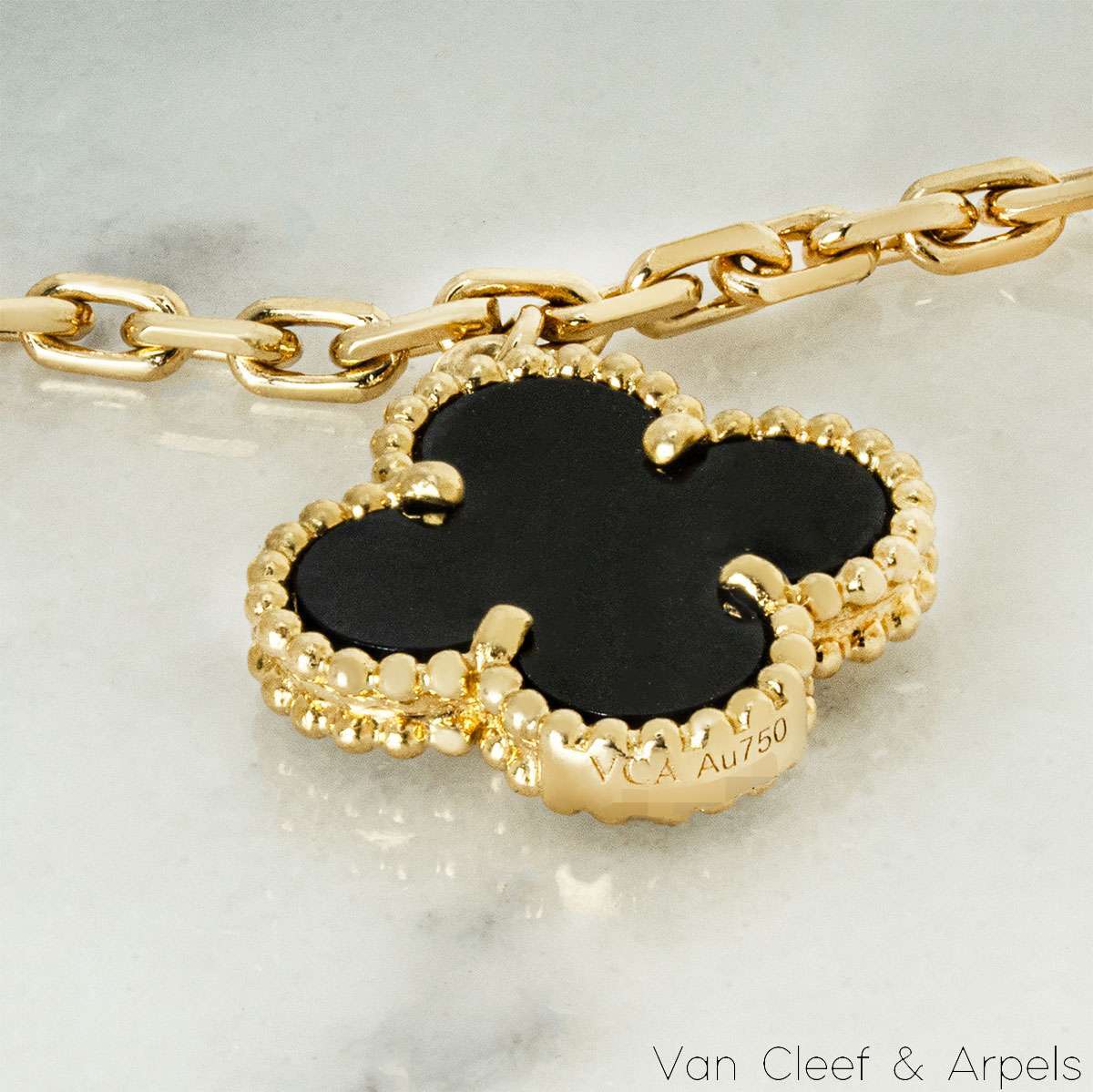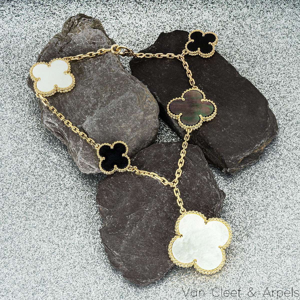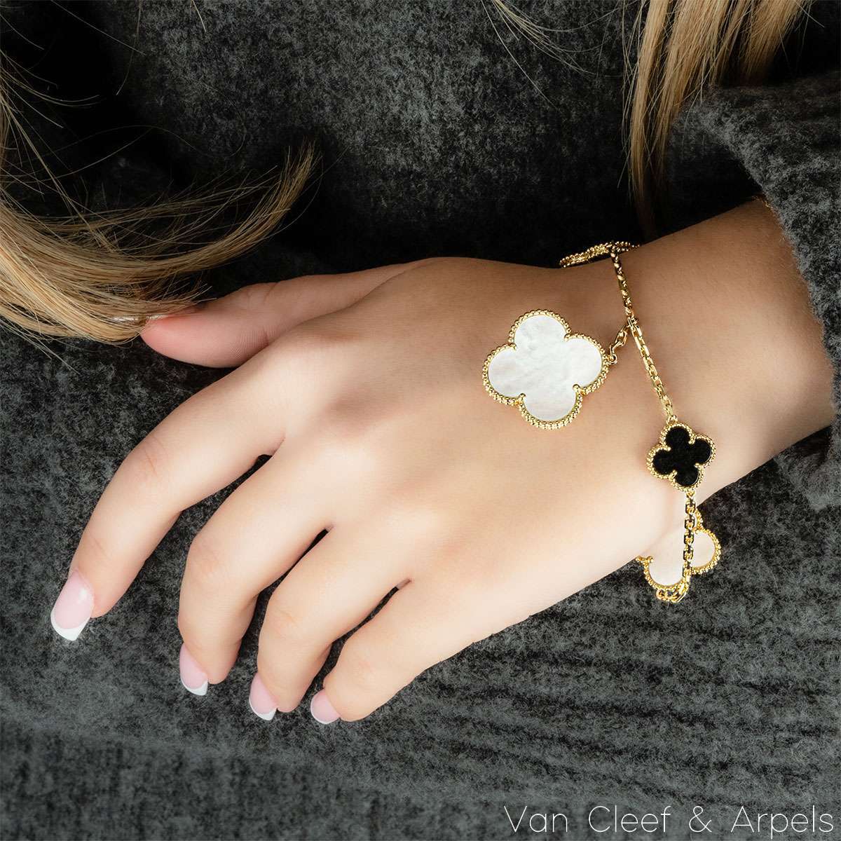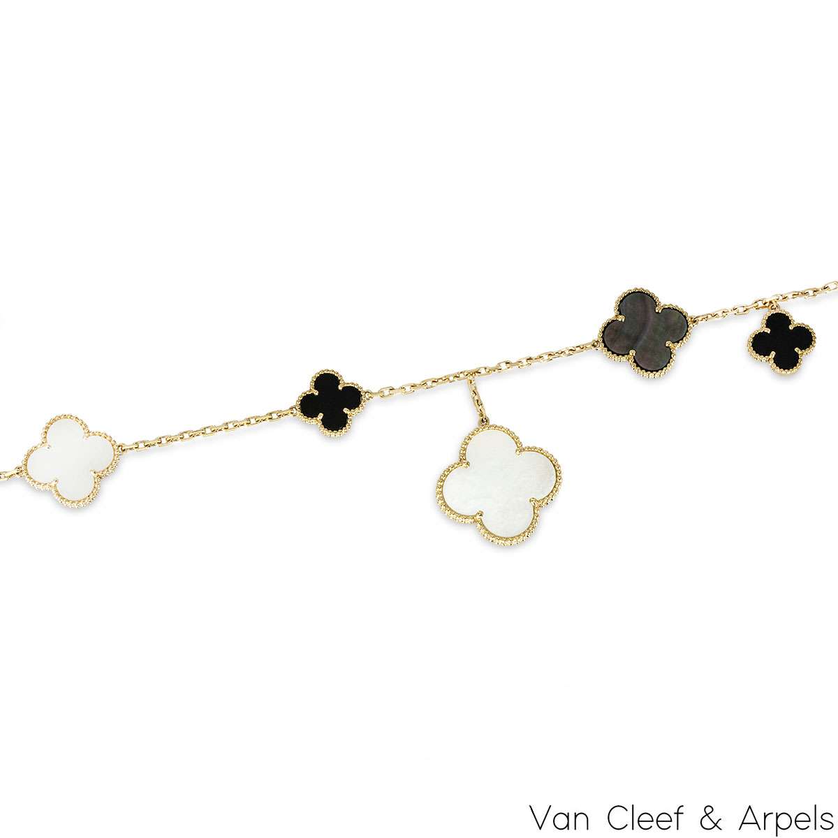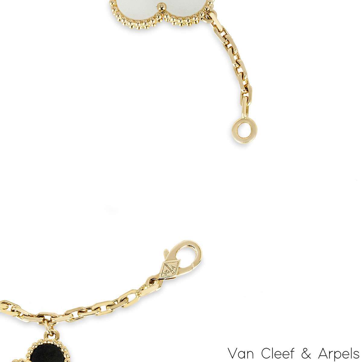 A luxurious 18k yellow gold mother of pearl and onyx bracelet by Van Cleef & Arpels from the Magic Alhambra collection. The bracelet features 5 four leaf clover motifs that vary in size, with 3 motifs set to the centre with mother of pearl inlays and 2 motifs set to the centre with onyx inlays, each complemented with a beaded outer edge. The quatrefoil motifs range in size from 15mm in width to 27mm and are separated by a fine trace link chain. The 7.5 inch bracelet finishes with a lobster clasp and has a gross weight of 18.50 grams.