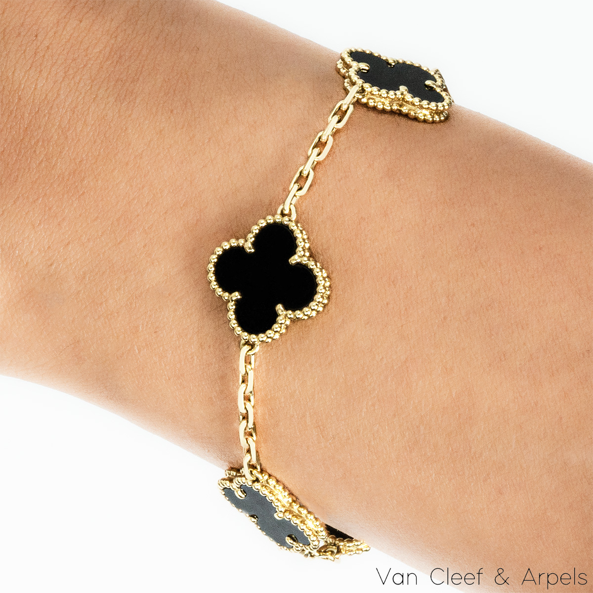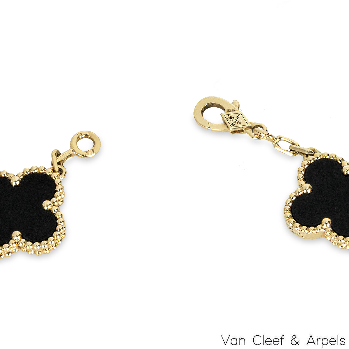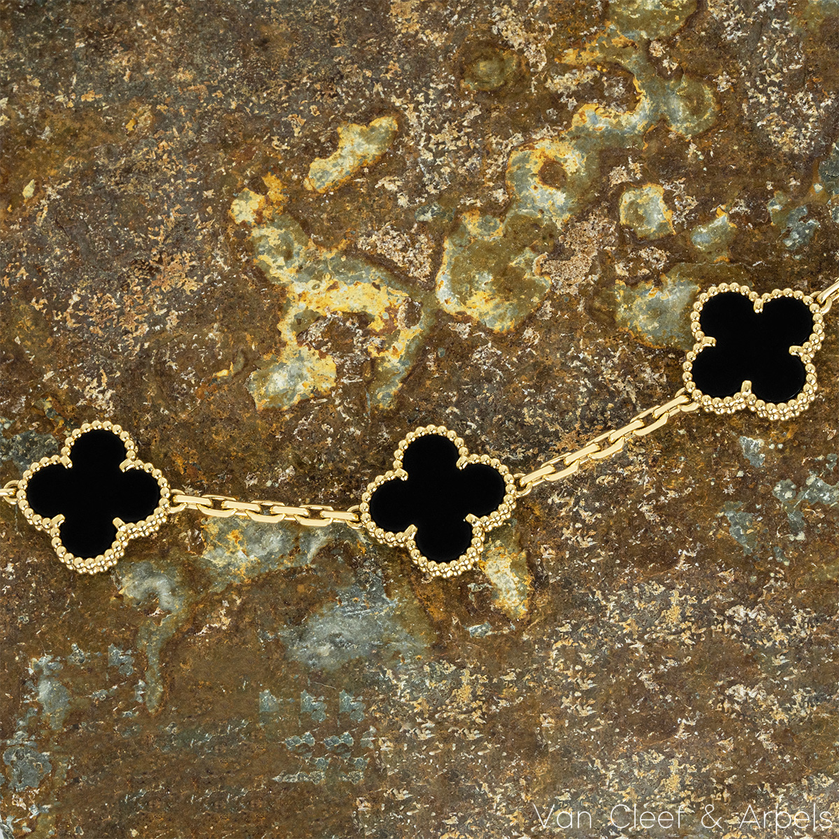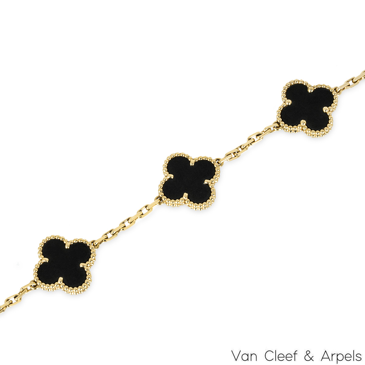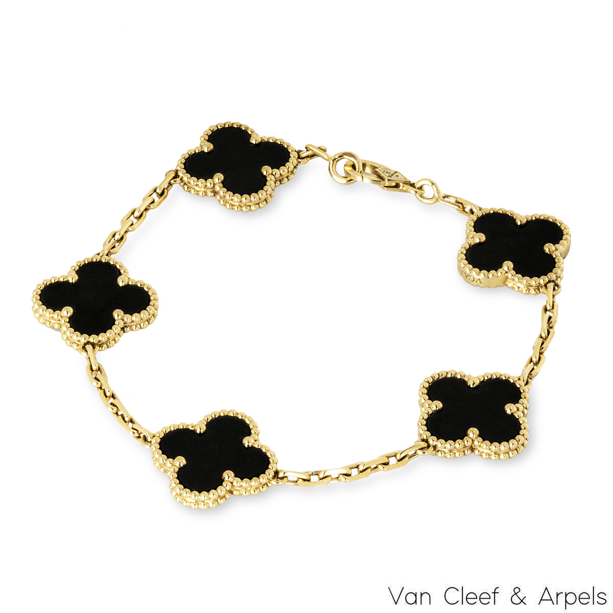 A timeless 18k yellow gold onyx bracelet, from the Vintage Alhambra collection by Van Cleef and Arpels. The bracelet is made up of 5 iconic clover motifs, each set with a beaded edge and a black onyx inlay. Measuring 7.5 inches in length, the bracelet finishes with a lobster clasp and has a gross weight of 11.4 grams.