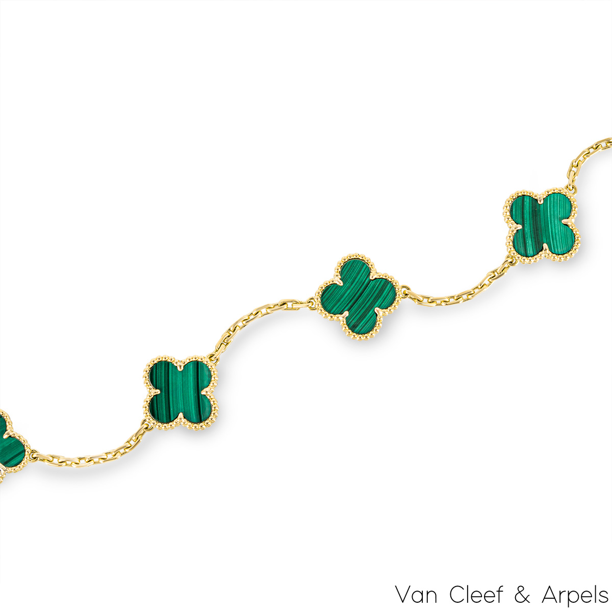 A gorgeous 18k yellow gold malachite bracelet by Van Cleef & Arpels from the Vintage Alhambra collection. The bracelet features 5 iconic 4 leaf clover motifs, each set with a beaded edge and a malachite inlay, set throughout the length of the chain. The bracelet measures 7 inches in length, finishes with a lobster clasp fitting and has a gross weight of 12.11 grams.