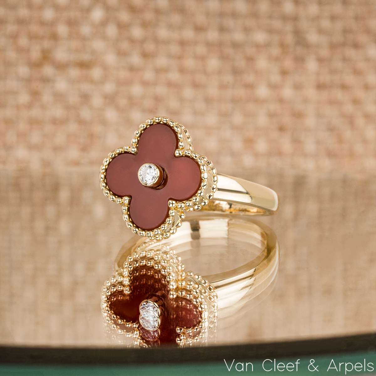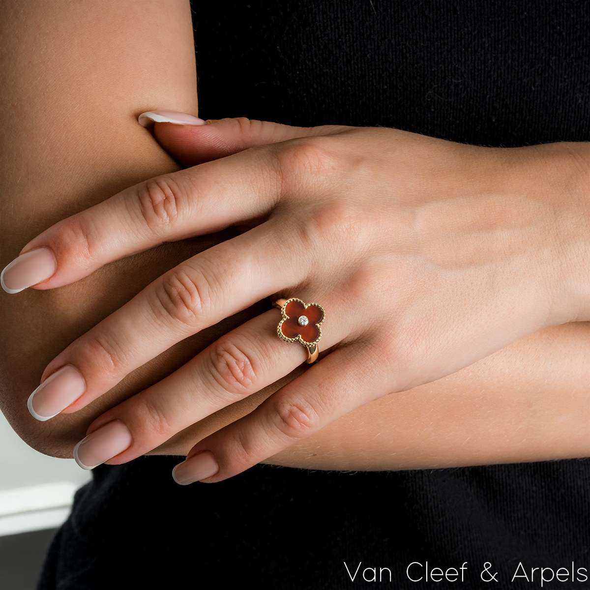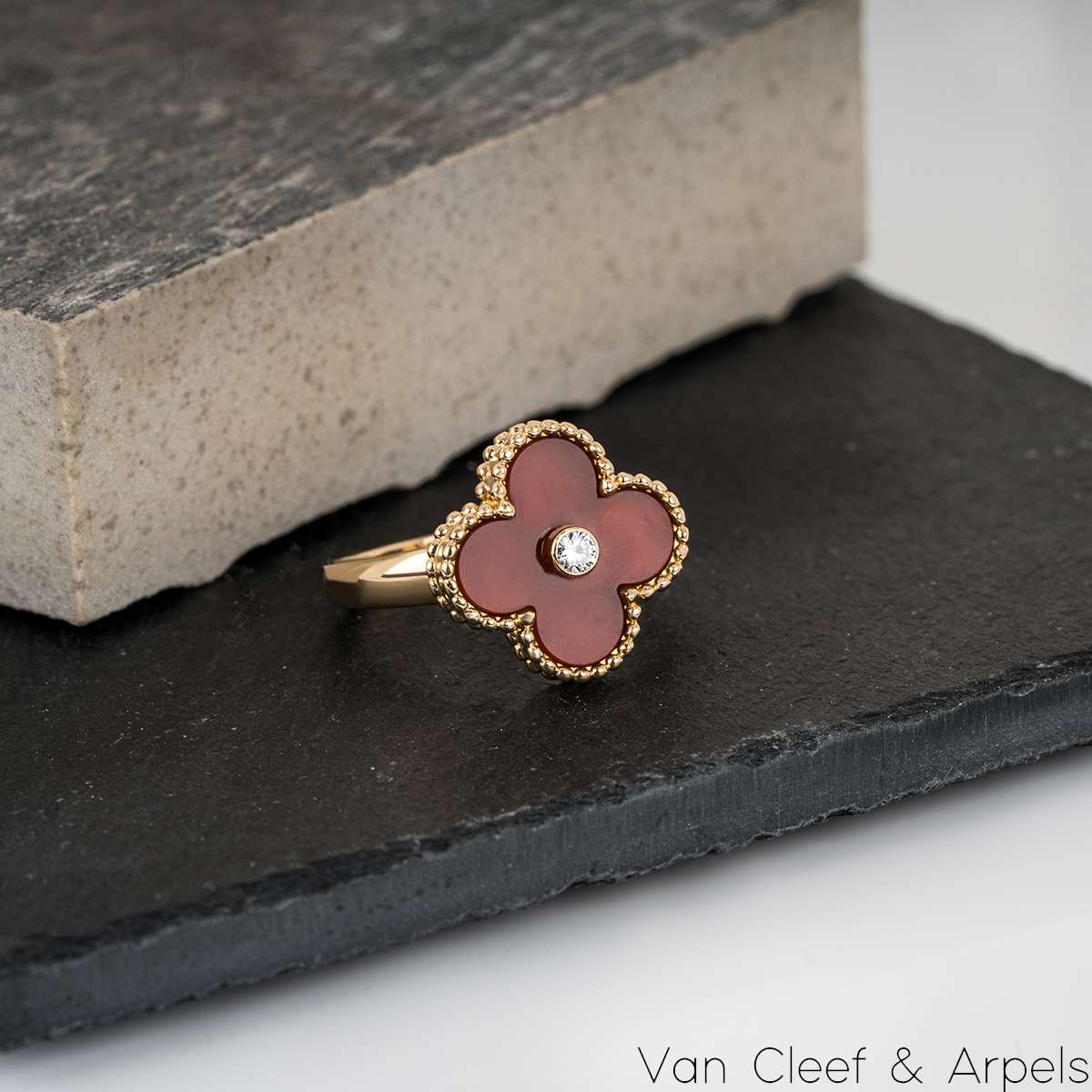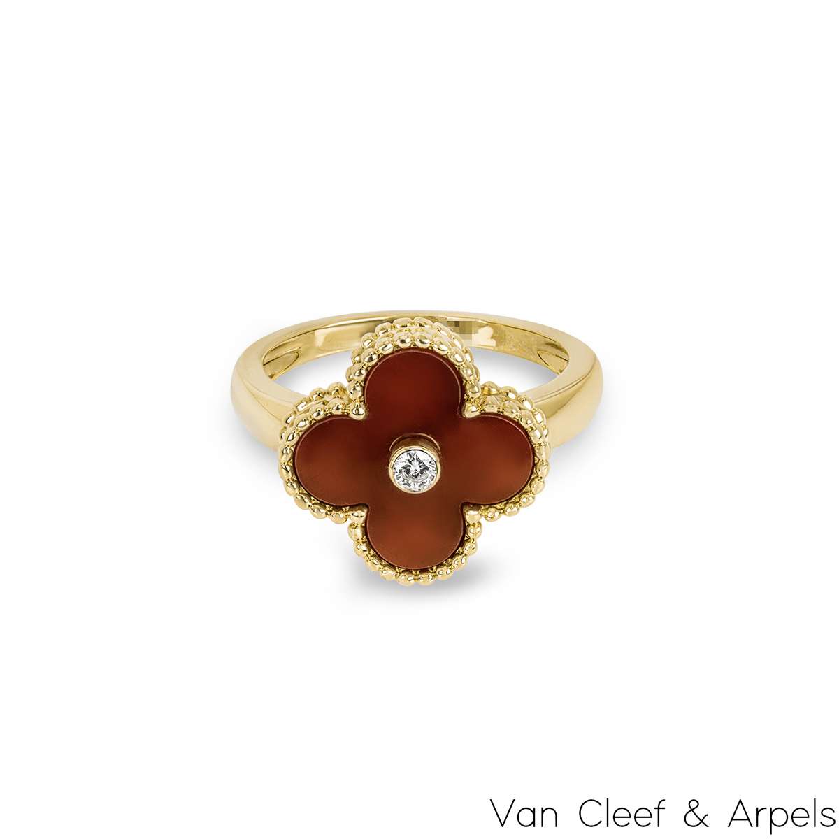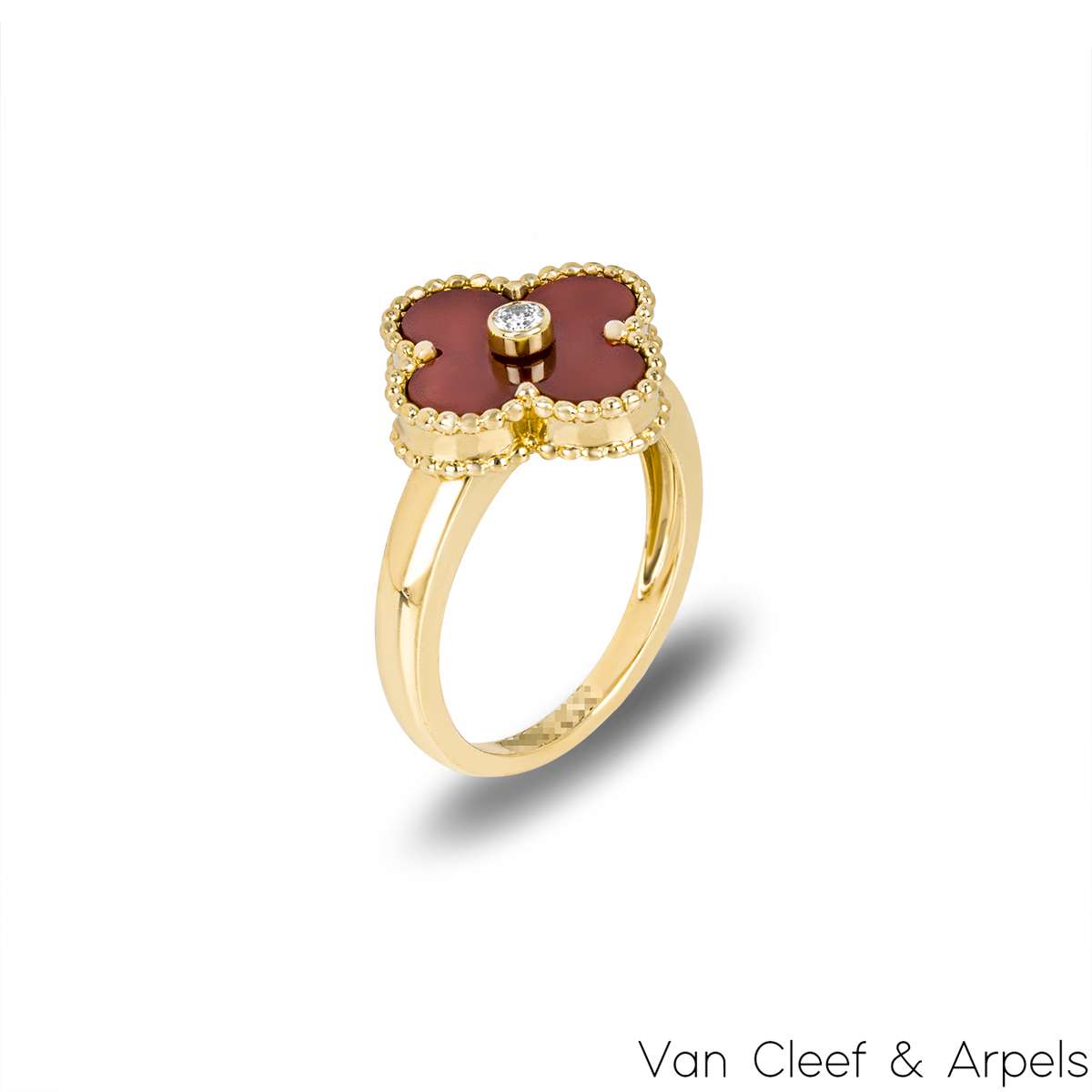 A beautiful 18k yellow gold Van Cleef & Arpels ring from the Vintage Alhambra collection. The ring features a four-leaf clover motif with a carnelian inlay, complemented by a beaded edge and a round brilliant cut diamond set to the centre, weighing approximately 0.06ct, E-F colour and VS clarity. The ring is a size M½ and has a gross weight of 7 grams.