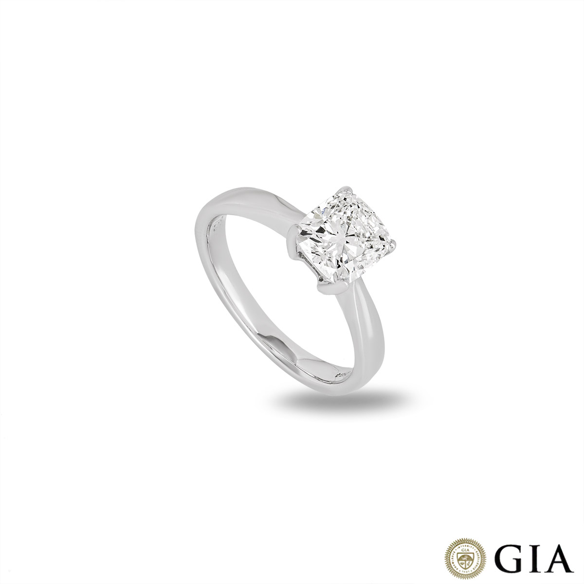 A beautiful 18k white gold diamond solitaire ring. The ring is set to the centre with a cushion modified brilliant cut diamond weighing 1.66ct, I colour and VS1 clarity. The 3mm white gold band tapers up into a classic four claw setting. The ring has a gross weight of 4.45 grams and is currently a size M but can be adjusted for the perfect fit.